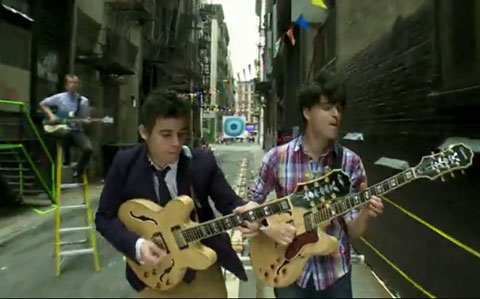 Following up on our post for "Cousins" The Song, here's "Cousins" the video: The single art's shot of the boys in a long alley doused in confetti fit the song's manically festive, church-belled punk racer, but is pretty much a direct still from the Garth Jennings-direct clip itself, which has the kids trade spaces on a moving platform and at the fringes, on ladders and wearing masks of each other. It's quick, quirky, and unpredictable but not without a sense of humor about itself, so pretty much perfect for a band of Ivy Leaguers who aren't above self-satirizing their prepped up ways. Also, love the colored-tape art by (or inspired by) Brooklyn's Aakash Nihalani. (UPDATE: Nope, not by Aakash. Interesting.)