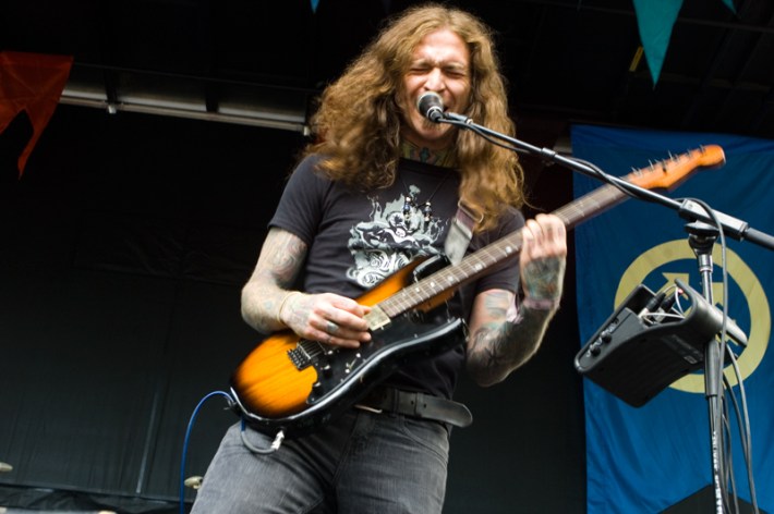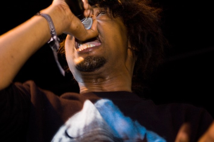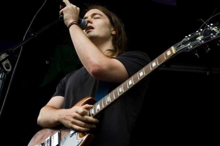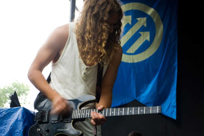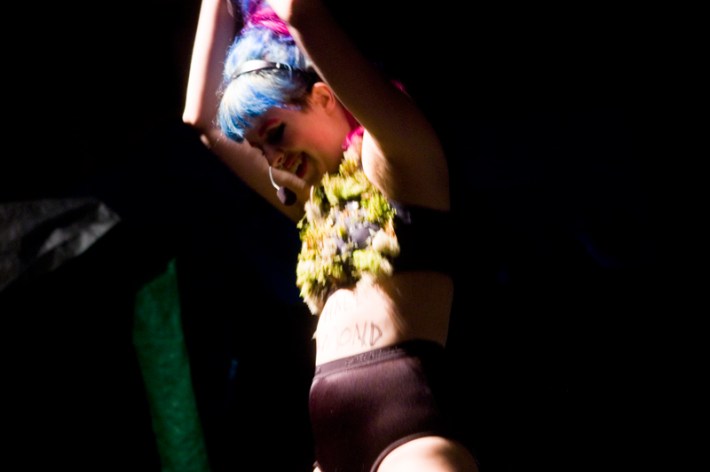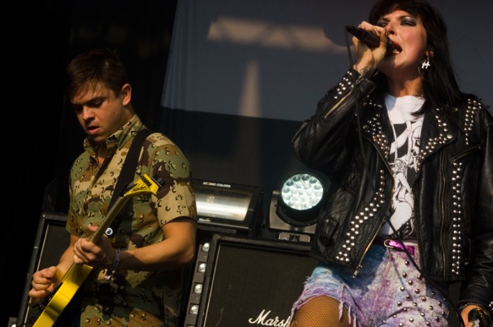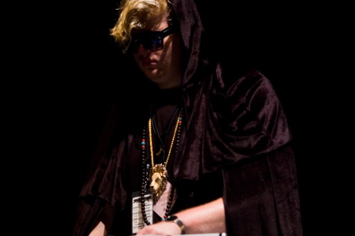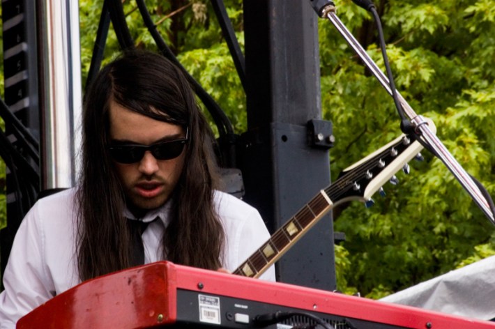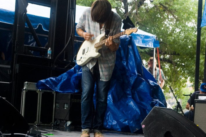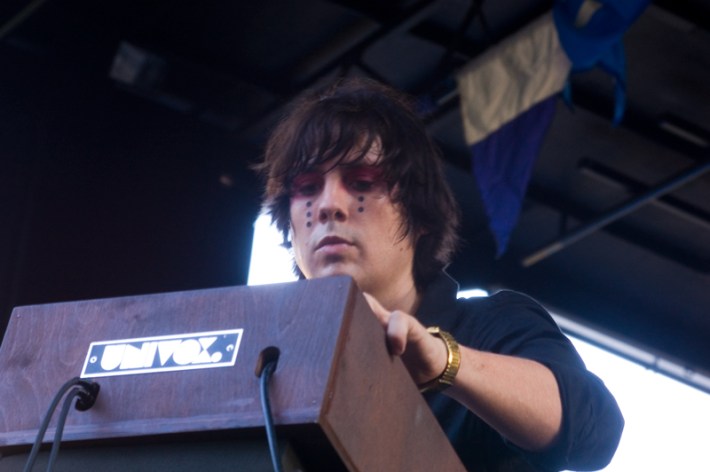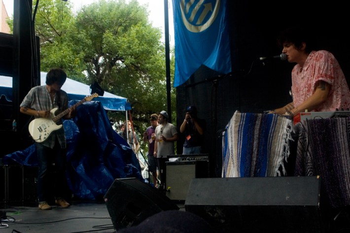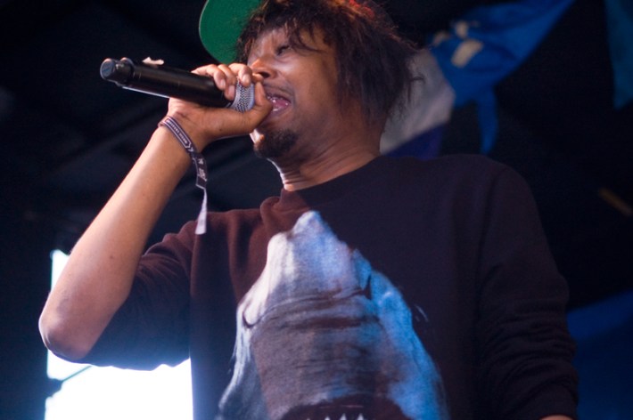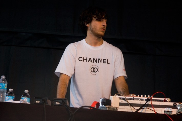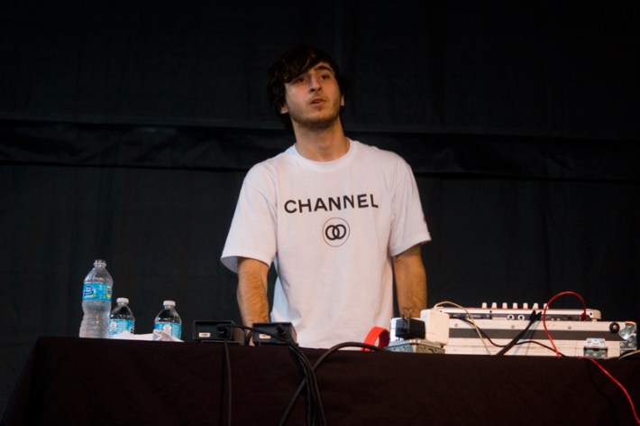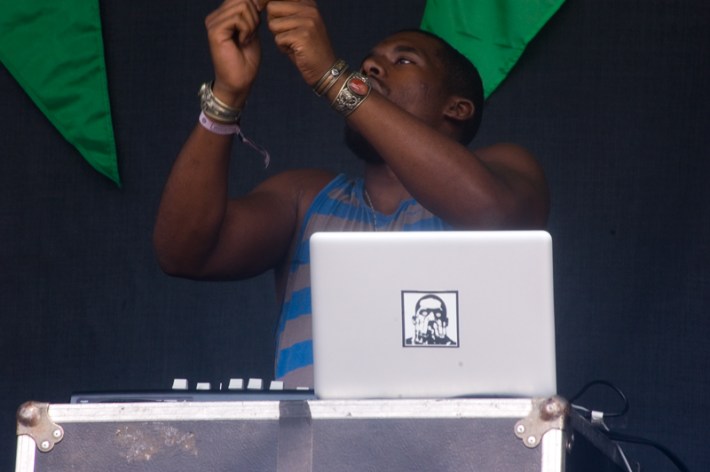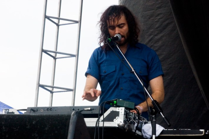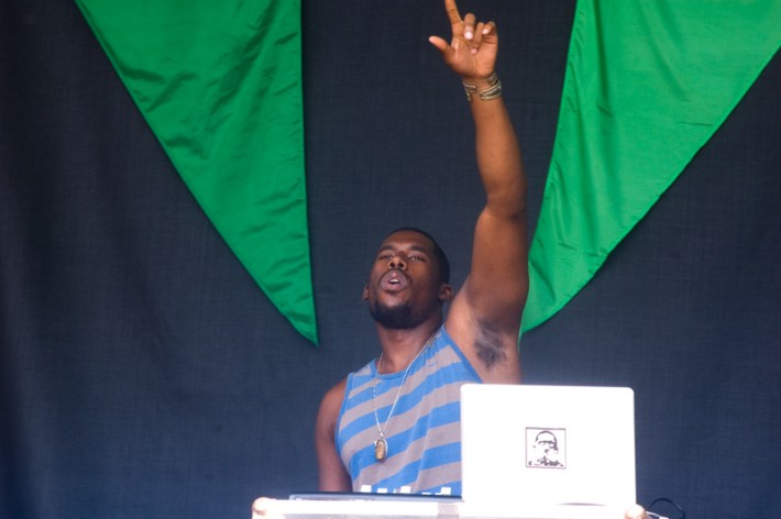 Hairy, loud acts like Psychic Paramount, the Atlas Moth and the ever-energetic Cloud Nothings got things going Saturday, but the interesting juxtaposition of Lotus Plaza on one stage and Atlas Sound on the other attracted most of the early attention. Lotus Plaza's set showcased Lockett Pundt's increasing confidence as a performer, while Bradford Cox hammed it up hard in the rain, using his set as both a platform for his reverberating solo work and as a lectern for his freewheeling rambles ("Get her room temperature water, not cold water," Bradford Cox said as he spotted someone having some trouble in the audience. "Cold water will put her into shock. That's something I learned in Boy Scouts before they kicked me out for being a queer.") The green stage is probably the best-sounding stage at the festival, for whatever reason, and that fact set up Flying Lotus and Sleigh Bells for bombastic sets; both artists are basically in their natural environment, with respect to the audience, at Pitchfork Festival, with Sleigh Bells' drawing the day's biggest crowd. Though I don't think Flying Lotus's show benefits from the hypeman (is this a thing he does now? "Were we in Africa just now?" the hypeman screamed as FlyLo dropped something vaguely tribal-sounding) he gets bonus points for leaving the vocal of "Headlines" untouched and sampling other drug-addled, festival-approved production in his mixes, tracks like "I'm God," "Yonkers" and his well-known "I Feel Like Dying" remix of Lil Wayne.