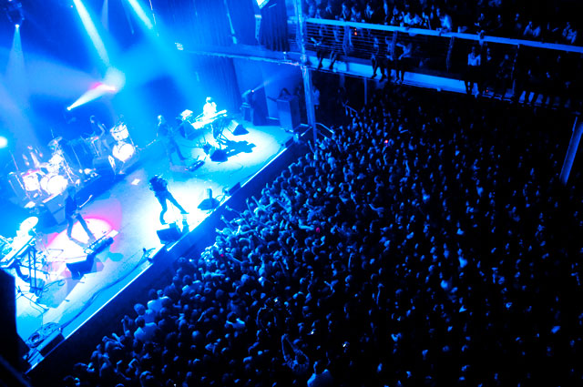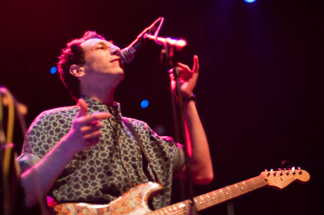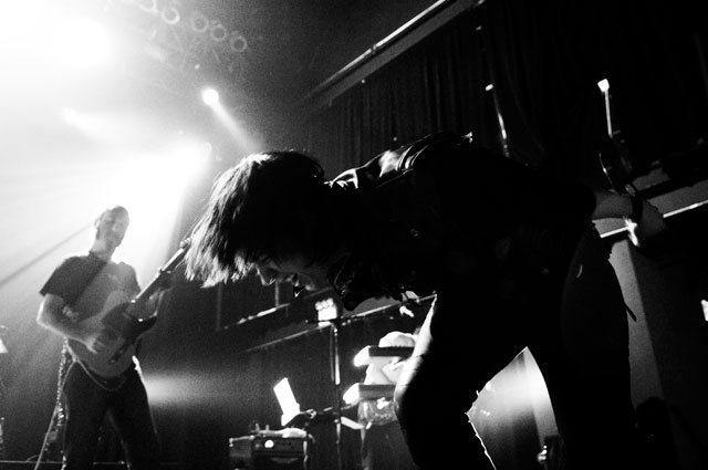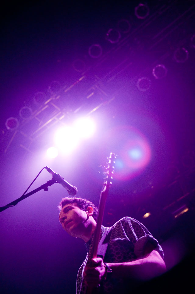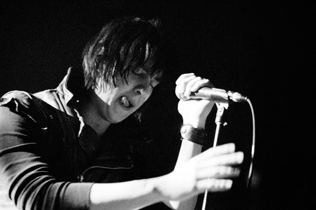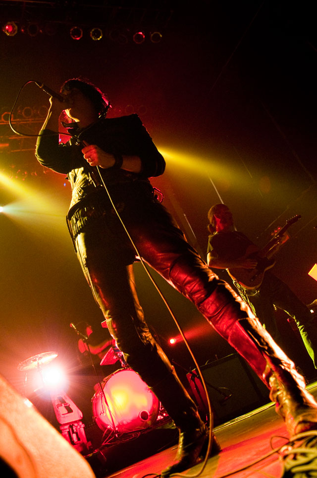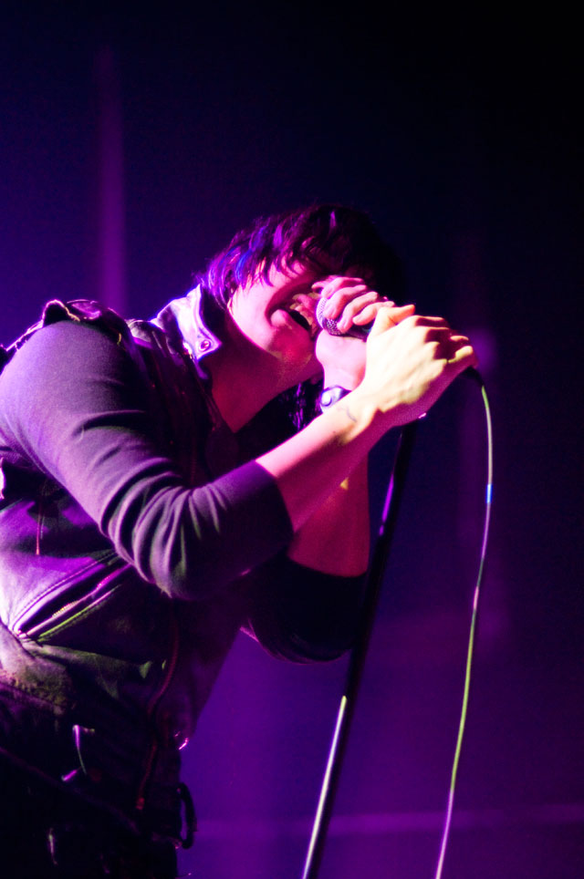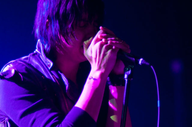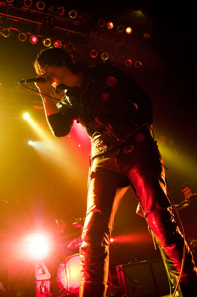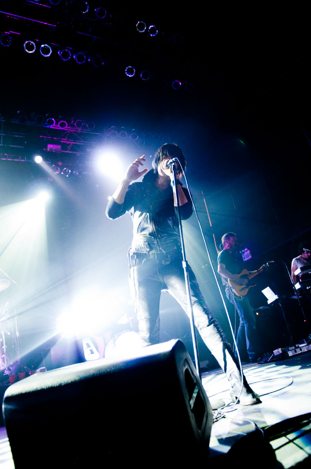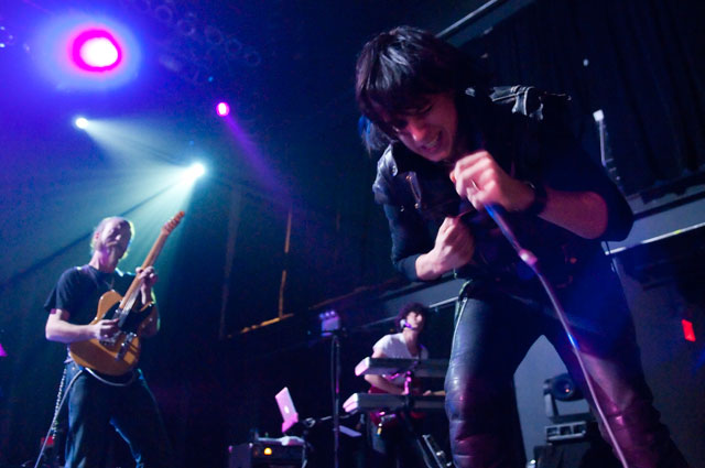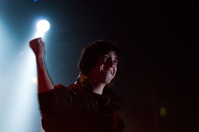 "Let's hear it for New Yoooooork." Early on in Julian's set at Terminal 5 last night, the first of a pair at that Hell's Kitchen hellhole, he began paying props to Alicia Keys's performance on SNL. "Both songs," he said, but it was "Empire State Of Mind" he kept teasing. It was the solo Stroke's "first show in New York in a long fucking time," and though it's often difficult to pin down his mood through that ever-present onstage mumble -- sober or not -- clearly he was glad to be home. Julian's career frustrations been highly publicized; this recent New York profile quotes him at length about how disappointed he was with RCA's botched job promoting Phrazes For The Young, and how he hemorrhaged money on the elaborate stage sets towering over his run of L.A. shows, scrapping them entirely for these gigs. ("In the end, it wasn't a positive experience for me at all ... I went broke doing it.") So last night we didn't get Julian's full vision for live Phrazes, though he "want[s] to do that in New York eventually. Badly."