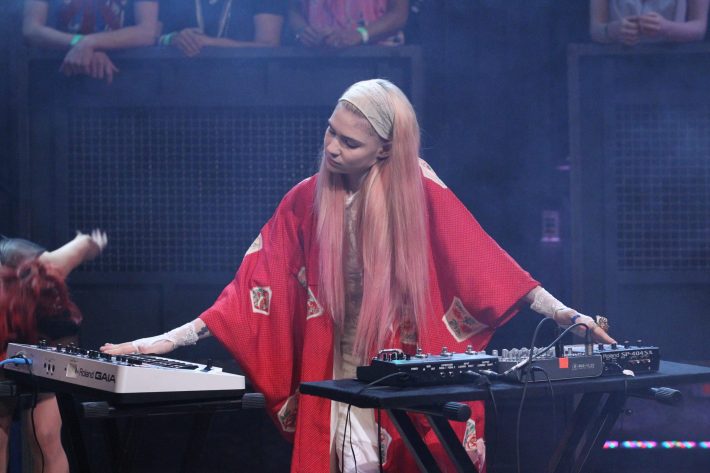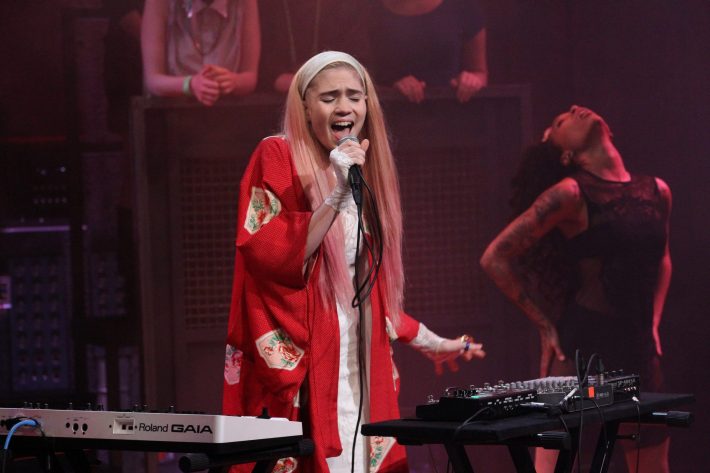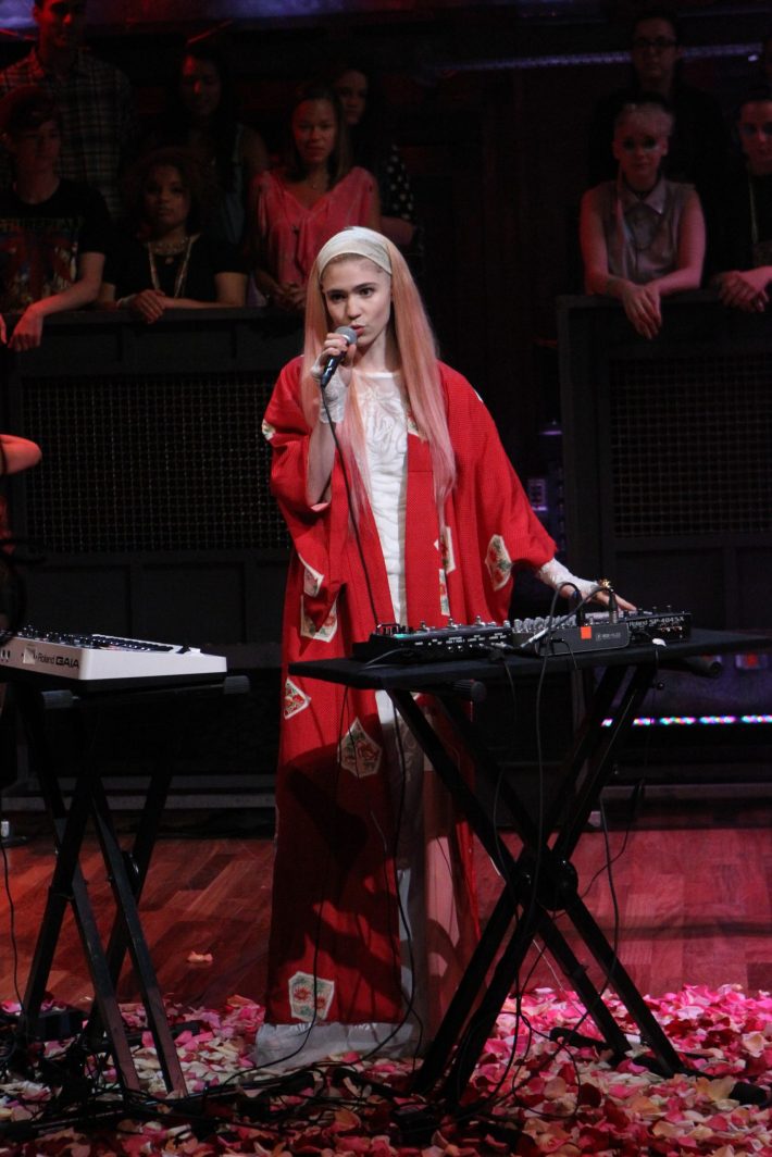Every time an internet-indie sensation makes her American network TV debut, an angel gets its wings, which means Jimmy Fallon is helpinga whole lot of seraphim get off the ground these days. Last night, Grimes came through the Fallon show to sing "Genesis," and we got the closest thing to the undiluted Grimes experience that I can imagine on a TV show. She rocked a gigantic flowery bathrobe, played one keyboard and one electronic doohickey (sometimes balancing her mic on her shoulder so she could manage them both) and stood on a bed of rose petals while two dancers flanked her and jets of steam occasionally shot up. So yeah, it was pretty great. Watch it and download the song below.