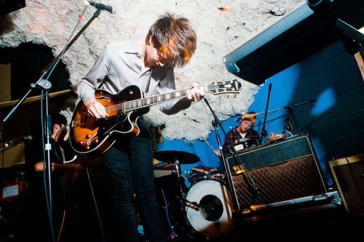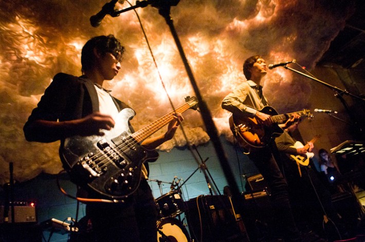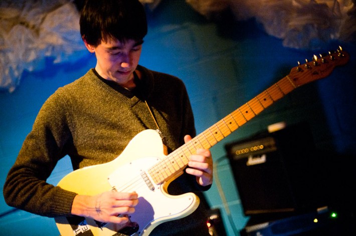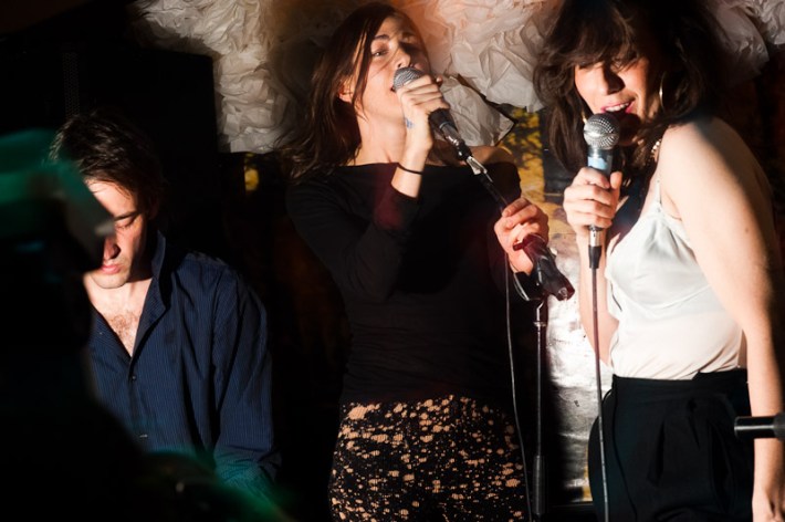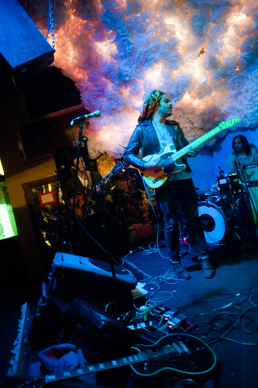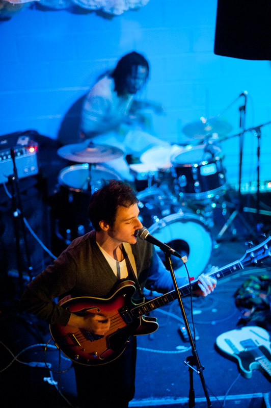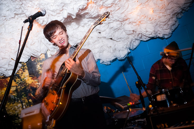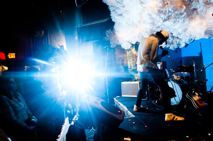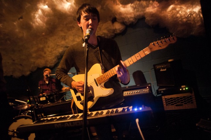 First off, this photo set is really great and worth a pass through, compliments in part to Glasslands gallery's new "cloud cover" installation, and in part to the always impressive camera work of Ryan Muir. Bands in post-title listed in order of dominance, although there's no reason to call winners between the morning benders and headliner Class Actress, both of whose sets alone made going out in the hostile cold for the marathon five-band lineup seem like the weekend's smartest decision. First, the morning benders. They recently relocated to this neighborhood, and put it on notice with their debut Saturday night as bona-fide Brooklyn residents. Their new album Big Echo is affecting, catchy, emotionally earnest. Clever indie pop, basically, with breezy West Coast melodies meeting the sort of artsy, ethereal sweeps and swells you might expect upon learning it's co-produced by Chris Taylor. Their live set nailed those elements unexpectedly well, innocent and endearing but not without force, high on presence and precision for a foursome so fresh-faced. Three years ago they had promise, but now they have "Promises," along with a full record of stuff well worth checking. Album's great, live show's a lock.