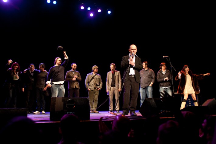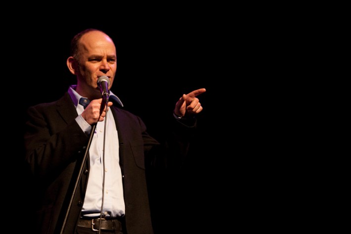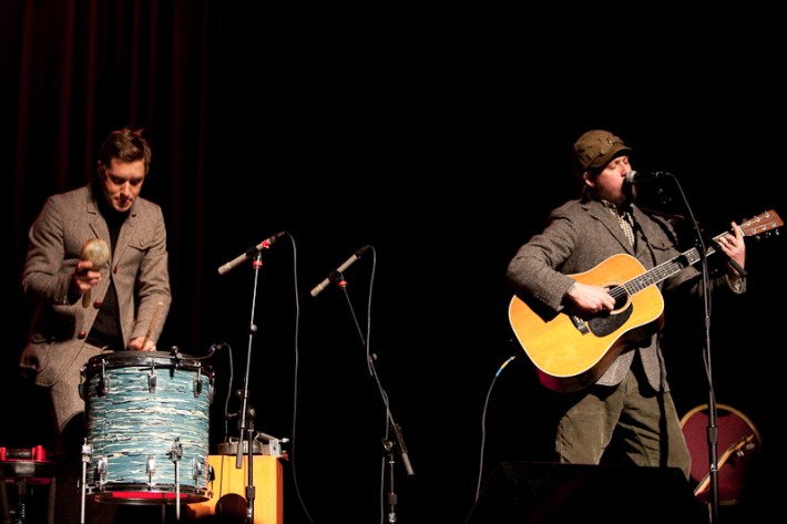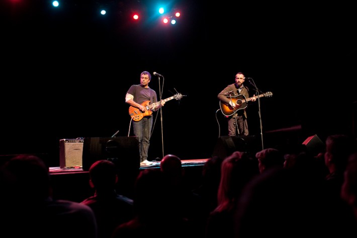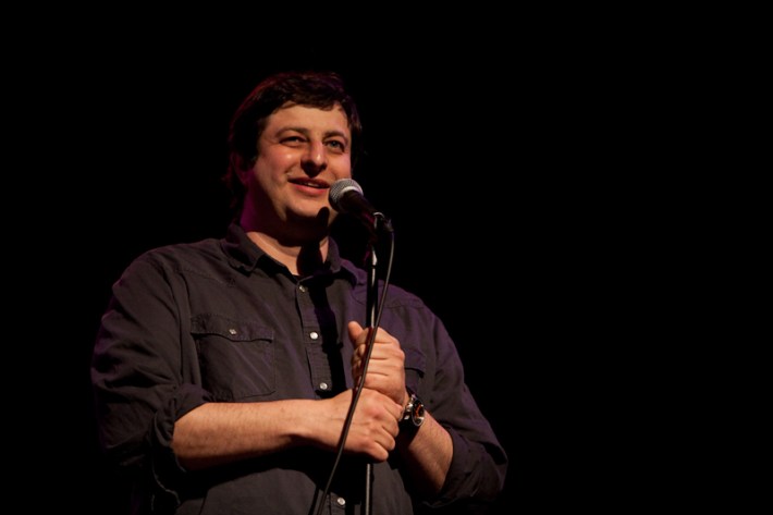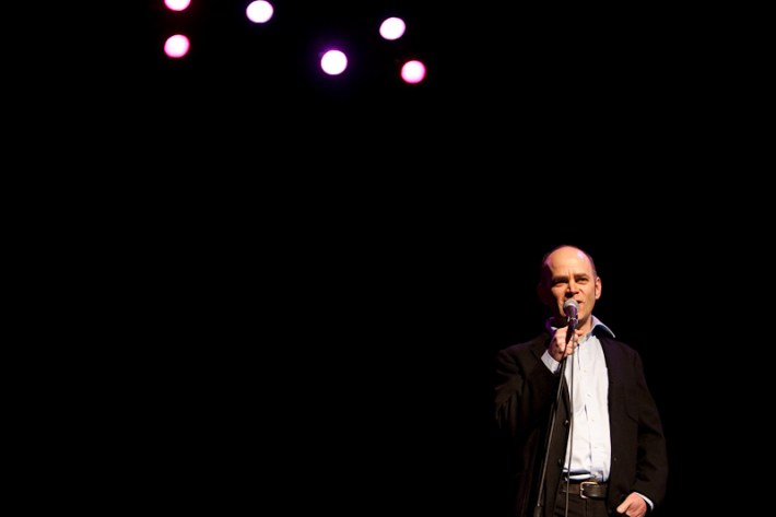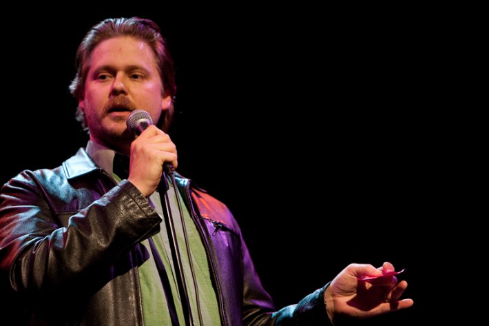 Not sure if musicians and comedians preternaturally get along together. But they definitely both hate cancer. So maybe this benefit for the Leukemia & Lymphoma Society was more of a my-enemy's-enemy-is-my-friend thing? Cancer-hating comedian Todd Barry hosted the Seattle event, which included past and present Sub Pop label mates Eugene Mirman, Isaac Brock, and James Mercer, alongside Neil Hamburger, Tig Notaro, Natasha Legerro, and Tim & Eric's Tim Heidecker. Seattle photographer Laura Musselman caught the event for us. Both Mercer and Brock performed sans bands; Modest Mouse recently announced a Friday spot at this year's Pitchfork Festival, and Mercer's prepping a Broken Bells debut album with Dangermouse.