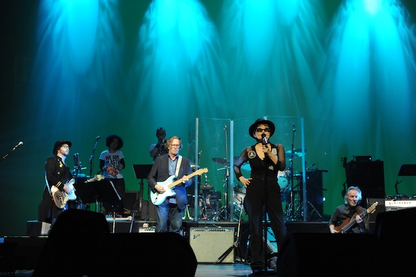 Where the first set was visceral in its vamps and psychedelic detours, set two was a more cerebral and goosepimply affair. On came the parade of cameos, covering and occasionally collaborating with Yoko, primary performers swapped out after nearly every song with background introduction from Sean. Kim and Thurston scraped guitars and bent guitar necks on the noise piece "Mulberry." Gene Ween and Sean duetted memorably on the quintessential turn-on "Oh Yoko." Drag queen Kiki aka Justin Bond (last seen at Doveman's release party) tapped the humor in "What A Bastard The World Is"; Doveman himself joined the proceedings for Bette Midler's effortlessly charismatic razzle dazzle cabaret arrangement of "Yes, I'm Your Angel." Bette was somewhat of a WTF punchline in emails between friends before this show; afterward all I wanted to do was rent Beaches. Either that or go deep into a Clapton excavation session. Eric joined the battery -- along with other original Plastic Ono Band member, bassist Klaus Voormann -- lacing creamy fretwork all over Yes I'm A Witch's "Death Of Samantha," muscling up "Yer Blues," stamping "Don't Worry Kyoko." Dude knows. As Paul Simon harmonized during his first performance with son Harper as a guitar duet, on "Silverhorse" and "Hold On," you couldn't help pause for thought: This was a serious show.