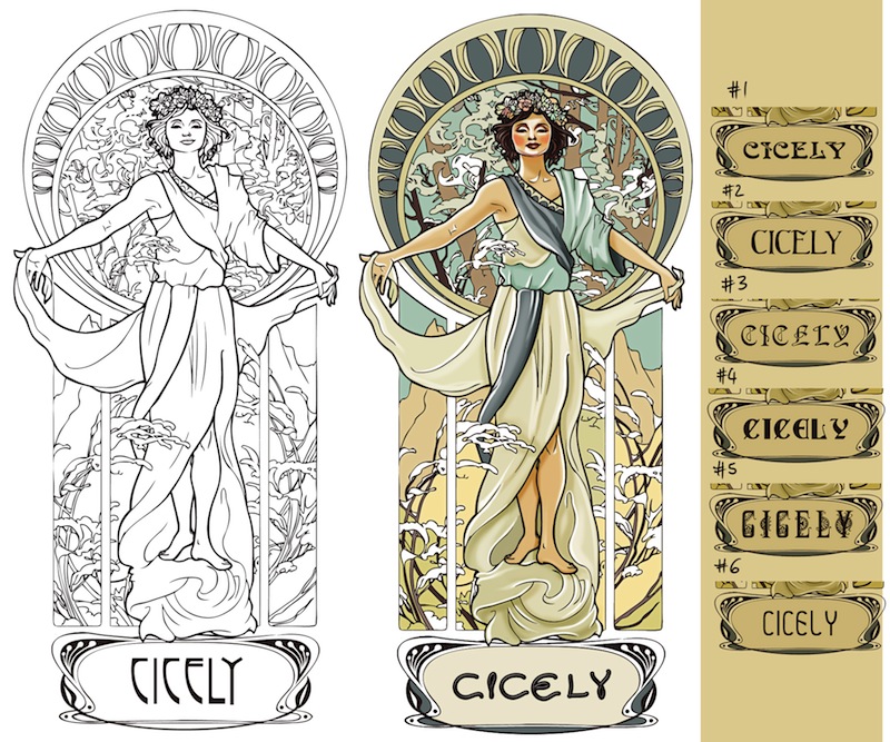Ill include some images of the actual episode, of Cicely herself, and of some of the Mucha pieces I want the shape and style to be like. A tall rectangular, stained glass, bold lines shadow box!