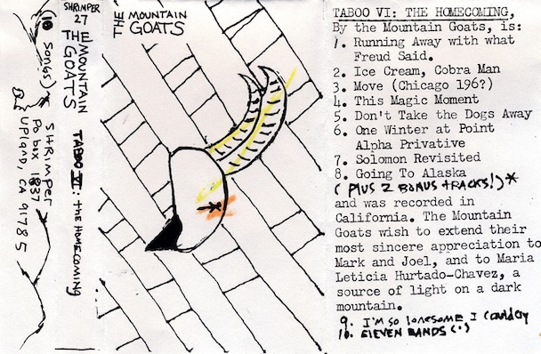 The uniformity of Darnielle's output -- nearly every song under four minutes, a singular recording approach until the 4AD years -- and the conceptual framework in which he works -- the "Alpha" and "Going to" series of songs, the Latin phrases that accompanied his releases for a time -- make it an ideal temptation toward completism. He's resisted the retrospective impulse, even as his songs burrow into the psyches of fresh crops of undergrads. There are no best-ofs, no expanded reissues, and just a handful of compilations gathering the harder-to-find stuff. There would certainly be some kind of market for them; on last.fm, the Mountain Goats' songs have been scrobbled 30 million times, a shade under Pavement's 32 million, and more than contemporary bands like Built to Spill (16 million), Yo La Tengo (24 million), and Guided By Voices (14 million).