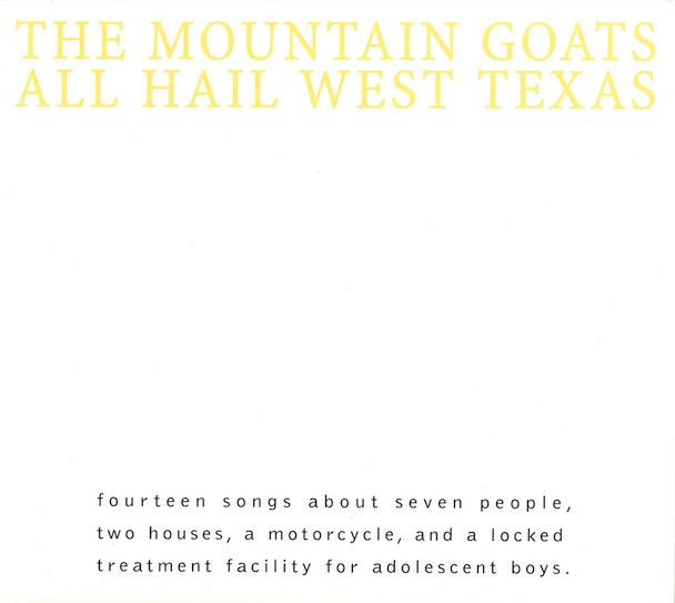 Hail and farewell, as an album title once put it. The Panasonic period comes to a close. All Hail West Texas centers on seven characters, but all but the most devoted fans needn't worry. Know that it begins with "The Best Ever Death Metal Band in Denton," a singalong shanty wherein, behind the beat, Darnielle delivers perhaps his most fundamental truism: "When you punish a person for dreaming his dream/Don't expect him to thank or forgive you." Or maybe it's "I am healthy/I am whole/I have poor impulse control," from "Riches and Wonders," a magnificently understated song of co-dependency (read: "love") that asks, ever so softly, for a New Romantic treatment. That and other triumphs like "Pink and Blue" (a gentle depiction of parental uncertainty) and "Blues in Dallas" (a lilting, major-key eschatological blues, backed by a stock Casio backbeat) make this a worthy effort, a 14-round bout with the hold of home. But Darnielle chose, wisely, to pack up and depart his monaural residence.