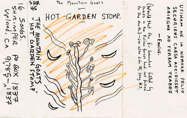 It's not exactly causation, but the Mountain Goats' cassette years fit snugly between the glory years of hardcore punk and the rise of anti-folk, two genres well-versed in making the personal political. And indie rock is lousy with "literate" writers, ironists and stylists like Dan Bejar, Christine Fellows, Bill Callahan, David Berman, Mark Stewart, and Kurt Wagner. And yet, who else could have written "Beach House," which spends two minutes warning about the deadliness of seals? Though Darnielle's sense of humor remains intact despite legions of freelance writers asking him what's the deal with all this metal, the idea of him indulging in these kinds of jokes now is unimaginable. The highlight here is "Sun Song," a dappled rebuke to someone's gardening skills.