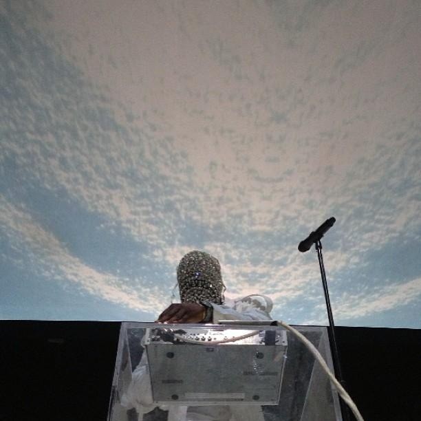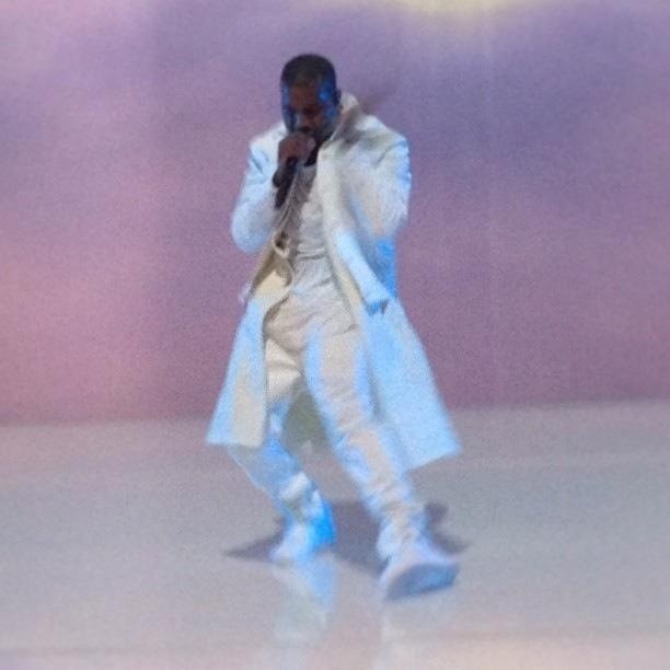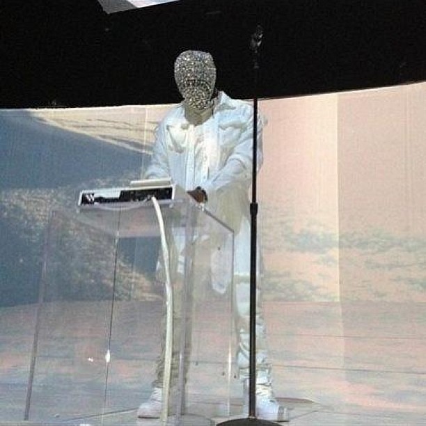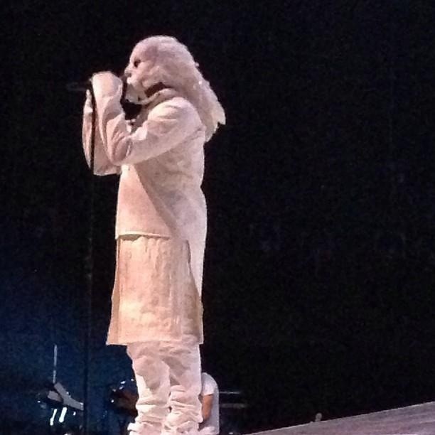 Last night a ridiculously attired Kanye West returned to Atlantic City's Revel Resort for the first of three "7 Screen Experience" concerts. The theme was winter, with Yeezy taking the stage to "Cold As Ice," opening his set with "Cold," and dropping snowflakes on the audience. The screens behind him displayed images of snow-capped mountains. And of course he was dressed like the Abominable Snowman. (The Abominable Snowman wears a white leather kilt, y?) Kanyeti later sported an outrageous diamond mask (designed by Maison Martin Margiela, according to CoS) while preforming his remix of Rihanna's "Diamonds." Check out photos above via TeamKanyeDaily, and a video (with terrible audio) below.