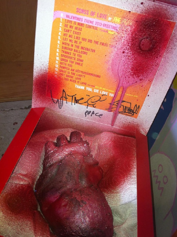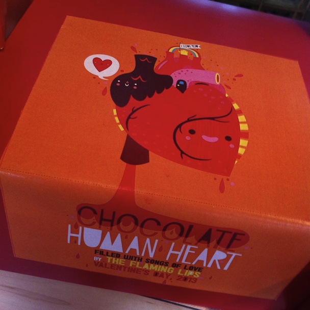 The Flaming Lips are no strangers to releasing music in unconventional formats -- heck, they've already released music inside human body parts made of candy -- so their '13 Valentine's Day treat shouldn't really come as a huge surprise to anyone: The Lips are releasing a compilation of love songs, contained on a USB stick, and packaged inside an anatomically correct chocolate human heart. The chocolate itself was created by Dude, Sweet Chocolate in Dallas, TX, and each box includes signatures from Wayne Coyne and Steven Drozd. They sell for $60 a pop -- that is, they were selling for $60 a pop, but they're sold out already. So unless you got in early, you're probably gonna have to go with a traditional heart-shaped box this V-Day (i.e., Courtney Love's vagina). Meanwhile, you can check out two songs below, as well as the tracklist for the comp, which will surely be made available sans chocolate pre-Feb. 14.