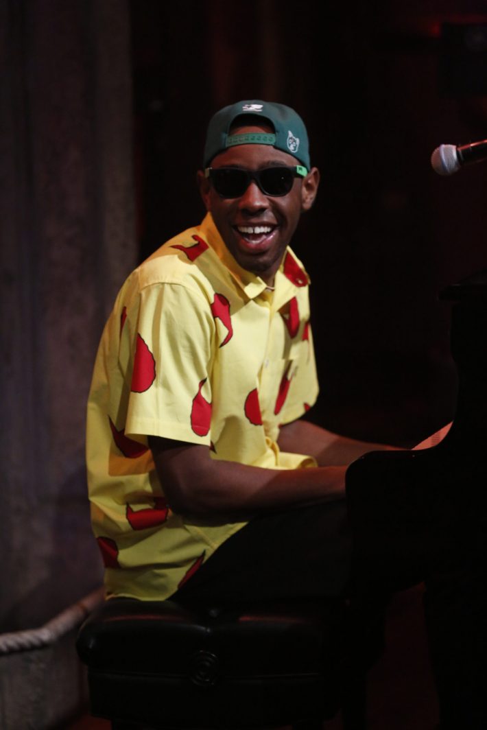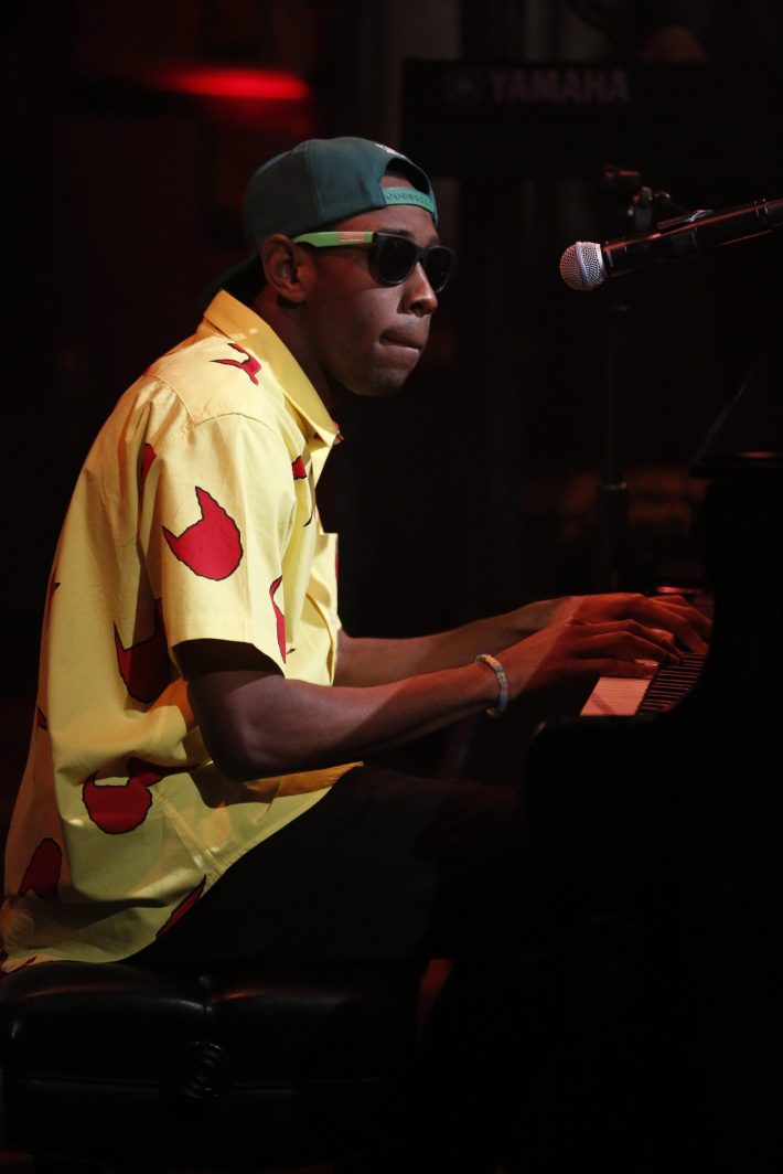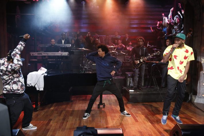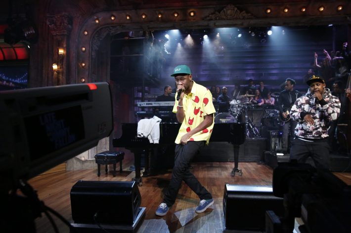 Perhaps the biggest moment in Odd Future's sudden rise to dominance came two years ago, when Tyler, The Creator and Hodgy Beats bulldozed their way through Late Night With Jimmy Fallon, giving a thrillingly unstable performance of "Sandwitches." Last night, an older and more seasoned Tyler returned to the show, performing a couple of track from his new LP Wolf with the Roots backing him up. He started out on piano, playing a placid new song called "TreeHome," sung by Quadrant Music's Coco, then transitioned into an all-over-the-place version of "Domo 23," with Odd Future buddies Taco and Jasper Dolphin on hypeman duties. And though it wasn't the startling moment that his last Fallon performance was, we were still looking at a furiously energetic young dude leaping on top of a piano and rapping his heart out. Watch it below.