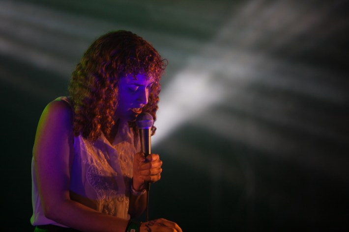 I was hopelessly in the tank for the Alabama-raised and Philly-based singer-songwriter Katie Crutchfield, who records as Waxahatchee; her new sophomore joint Cerulean Salt is easily my favorite album of 2013 thus far. So when Crutchfield started off her set by projecting basically nothing, staring off into the middle distance and knocking out a sloppy guitar figure, my heart sank a bit; I just wanted her to succeed so badly. Pretty quickly, though, it became apparent that this is just Crutchfield's own peculiar stage presence, and it becomes enormously likable when you let it marinate. In the end, I liked everything about this show. I liked how her bassist was an eager goof who couldn't wait to make terrible between-songs goofs. I liked how Crutchfield stuck to the bouncier, punkier stuff from her albums, clearly realizing that scraped-raw confessionals wouldn't go over in a room like that. And I loved how she gave Paul Simon's "The Boy In The Bubble" the most fuzzed-out, nonchalant cover you could ever imagine; I was grinning like an idiot all through that one. So yeah: Still in the tank. -- Tom