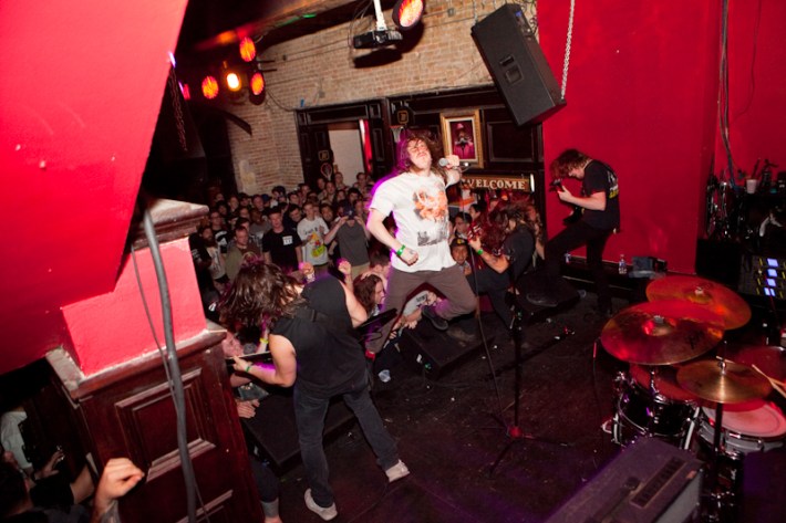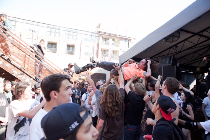I made my way to the front of the crowd in advance of Trash Talk's set, and once there, I tried to formulate an exit strategy for when things got ugly. It was my first time seeing the band, but I had sent a writer to check them out last year, and he came back with reports of Battle Royale-esque chaos. All throughout the SXSW showcase I had noticed that the all-ages show was crowded with teenage dirtbags with X's on their hands, and I especially noticed those kids gathering toward the front of the stage -- around me -- before Trash Talk's set. My plan was to hang in the pit long enough to get ONE clear pic to post on Instagram, then scram before the shit went Thunderdome. My plan was flawed. On the first drum hit, before frontman Lee Spielman even took the stage, the pit exploded into outright violence. FULL bottles and cans were whizzing -- rocketed, not lobbed -- across my periphery. I was pushed against the stage, where I was more or less stuck, defending myself from all sides. It wasn't where I wanted to be, but it was a blast: How many bands today have fans willing -- eager, even -- to sacrifice their bodies at the altar of worship? Sure there are terrifying hardcore pits every weekend in clubs in and around Boston, but how many are packed with kids who look like Degrassi extras? It was all balled fists and hard elbows; I stayed alive simply by being bigger than the wet rats around me. I finally got off a couple cool shots -- including one of Spielman climbing up to and walking along a thirty-foot-high ledge, his leg already in a cast -- but as I was choosing a filter for the stupid thing (or maybe it was when I was adding the hashtags?) -- I got clocked in the head by the knee and/or boot of a dude who'd flown down from ... somewhere. Behind me, above me, in front of me, I'm not even sure. I didn't hit the ground; the fellow in front of me was not so lucky; he walked away dazed, rubbing his neck, with a spooked look in his eye. I did lose my sunglasses in the scrum. At that point I put the phone away, and put up my dukes. -- Michael