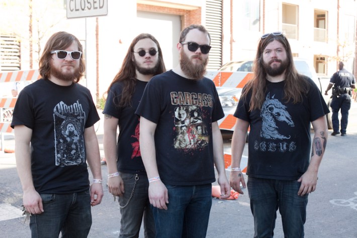 We had Pallbearer's 2012 debut, Sorrow And Extinction, at No. 1 on our list of 2012's best metal albums, and three moths after compiling that list, I'm struck by how obvious that choice was, in retrospect: Sorrow And Extinction wasn't just the best metal album of 2012; it was the best metal album of 2012 by an order of magnitude. Nothing else even came close. As far as I'm concerned, Pallbearer are the most vital, important act in metal today, and I'm more excited for their sophomore LP than I am for any other metal release due in the next two years. The last time I saw them, though -- last year in Brooklyn with labelmates Loss -- I was kind of let down; some of the band's majesty seemed absent from the performance. Loss (who rule anyway) were clearly the better band that night. I've been eager to see them again, though: because I've heard so many positive reports from people I trust, because I love Sorrow And Extinction more now than I did then. Unfortunately, Pallbearer's SXSW show had many of the same problems I experienced during their Brooklyn set: Frontman Brett Campbell seems to always be straining, and slightly off pitch -- as if his songs are written in a register above his own. NB: This is not a problem on Sorrow And Extinction, on which his vocals are as rich and clear as a young Ozzy's, and it may not be a problem at Pallbearer shows other than the ones I've attended -- as I said, people I trust have passed along word of being floored by Pallbear's live set. To be clear, the band's instrumental prowess is fluid and flawless, and their songwriting -- including Campbell's towering melodies -- is truly remarkable. But of the large crowd that gathered for Pallbearer, about half seemed to be nodding along in hypnotized rhythm, the other half seemed kind of bored -- talking to one another, looking around, checking out their phones. I was alternately in both camps, still waiting to be blown away for real. I'm confident it'll happen: The band closed with a yet-unnamed new song, which didn't do anything to make me less excited about their future. -- Michael