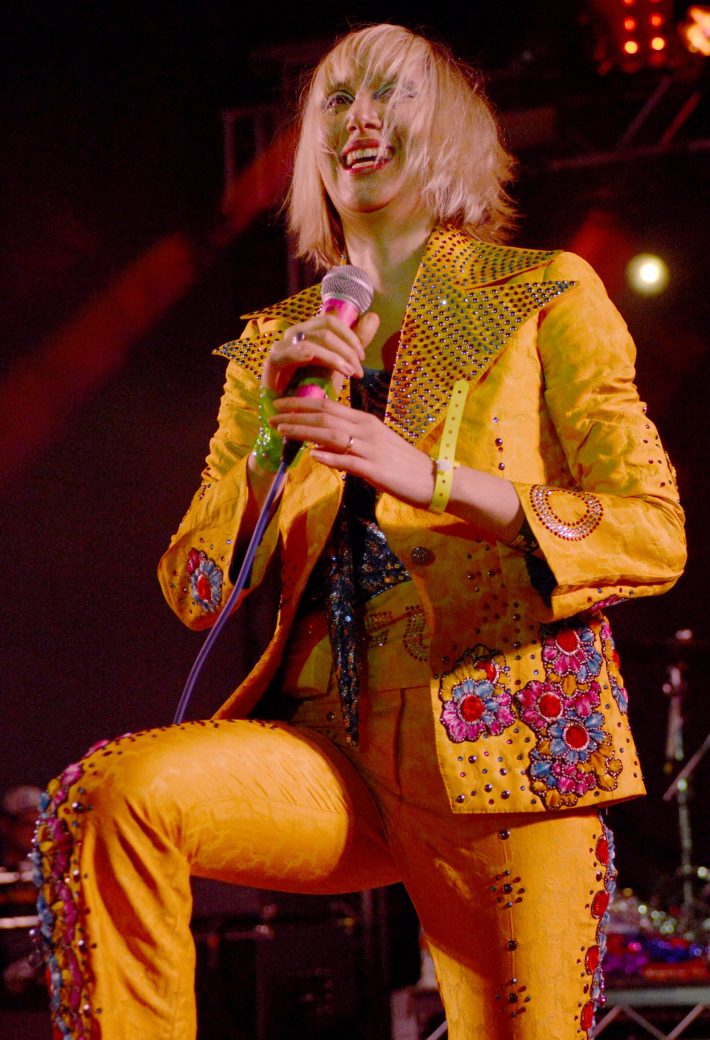 Last night, after sets from Nick Cave and Café Tacvba, Yeah Yeah Yeahs played to a rapt audience at Stubb's outdoor stage for NPR's SXSW showcase. Sporting a bedazzled, bright yellow suit, one neon green glove, and a headlamp, Karen O led the band through a raucous 12-song set that included four cuts from the forthcoming Mosquito: "Under The Earth," "Subway," the title track, and first single "Sacrilege." See the full performance and setlist below, and check out photos above.