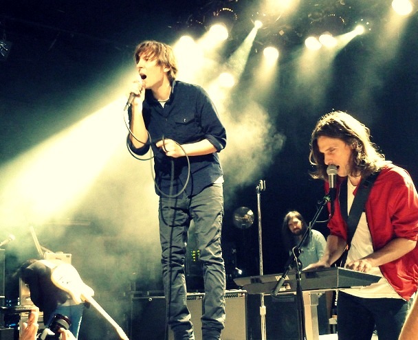They didn't do anything from United at MHOW; they didn't even do anything from Alphabetical, and they did only one song from 2006's It's Never Been Like That (thewonderful single "Long Distance Call"). The rest of the set was split evenly -- seven and a half songs each -- between 2009's Wolfgang Amadeus Phoenix, and the forthcoming Bankrupt!, due in two weeks via Loyauté/Glassnote. (The halved songs were Wolfgang's "Love Like A Sunset" and Bankrupt!'s title track, which were deconstructed and combined to form a mashed-up monster called "Sunskrupt!," one of the set's most magical inclusions.) I imagine their upcoming shows will dip a bit deeper into the back catalog -- it would be a shame if they didn't -- but the MHOW performance provided a fine showcase for the new material, once again made more robust in the live setting, thickened by prominent guitars and forceful rhythm, by sheer loudness. When we interviewed the band last week, vocalist Thomas Mars noted, "We are always so loud in the studio. I’m not sure how this record will sound when played at lower volumes." But regardless of the volume at which they're played, Phoenix records have a tendency to sound slightly gauzy, ephemeral; it's part of their appeal. Live, on the other hand, they're a dominant presence. The band members have great physicality and charisma, too, feeding off each other, alternately snaking and roboting, alternately fluid and jerky, alternately hammy and absorbed. They interact with the audience, too, their expressive faces and eyes squinting into the room, smiling. At MHOW, Mars jumped into the crowd a couple times, once making his way to the back of the venue and climbing up on the soundboard, from where he sang. The entire crowd was spun around, looking at one another, seeing their surroundings from a new vantage.