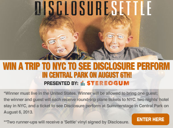 By now you should be familiar with Disclosure, the young British siblings behind Settle, the best dance album of the year so far. We've seen them in concert a bunch this year -- in Brooklyn and Manhattan and at festivals like SXSW, Coachella, and Sasquatch! -- and were roundly impressed with how the duo brought skittery, melodic earworms like "White Noise" and "When A Fire Starts To Burn" to life onstage. The brothers Lawrence will be back in NYC on 8/6, performing at Central Park Summerstage (the bill also includes TNGHT and Julio Bashmore) and Stereogum and Interscope are giving away a trip to attend. One winner will receive flight and hotel for two to NYC and tickets to the show. Two runners-up will receive signed copies of Settle on vinyl. To enter, just fill our your information here or click on the image below. The winner will be notified shortly after the sweepstakes ends on 7/22. Good luck!