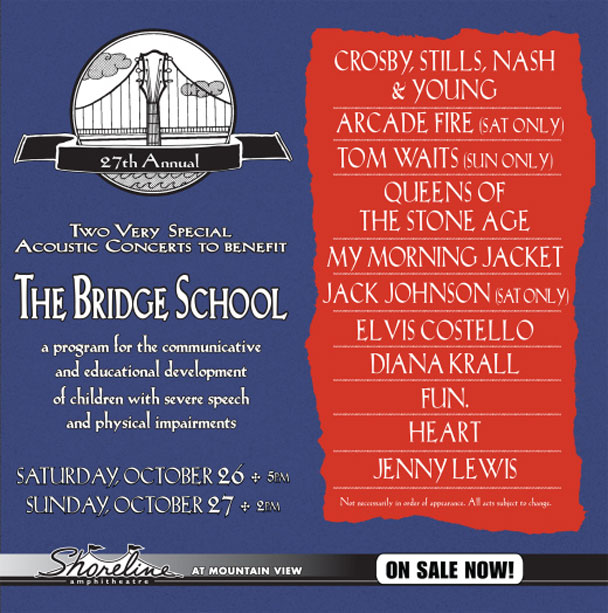 Every year, Neil Young hosts the Bridge School Benefit, a star-studded two-day acoustic fundraiser for the special-needs school he founded with his wife Pegi. Now in its 27th year, the 2013 fundraiser features sets by CSNY, Arcade Fire, Queens Of The Stone Age, Tom Waits, Elvis Costello, fun., Jenny Lewis, Heart, My Morning Jacket, and more. All those artists appear both days, except for Arcade Fire (only Saturday) and Tom Waits (only Sunday). You can stream it below starting tonight at 8 PM EST.