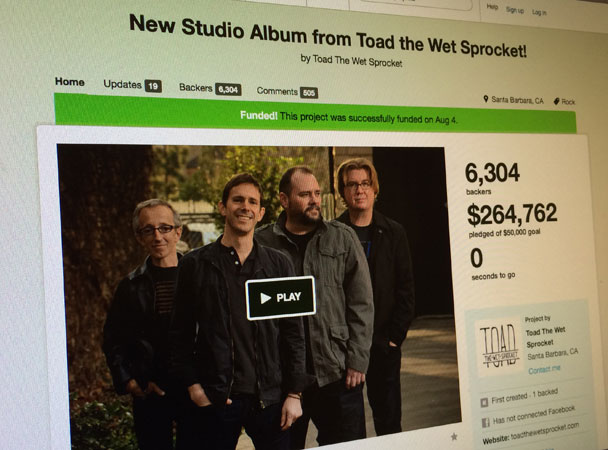 Nostalgia and a dedicated fan base led to Toad the Wet Sprocket's successful campaign to manufacture and market their first recorded album in 16 years. When they started their campaign, the Santa Barbara group promised the album would be released once their initial goal of $50,000 was raised, figuring they would have at least a month to get everything together. Instead, their fans raised the money in 20 hours and the band had to scramble to get the album ready in time and had the digital version ready to go by June 29, with the physical release following on September 17. With the swell of support from their fans, Toad The Wet Sprocket because the fourth highest-funded music Kickstarter of all time, right behind Anamanaguchi, and raised over $260,000 by the end of the project.