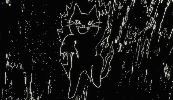 I IM EYE MY is a new project from Al Creedon of Bleeding Rainbow and Sean Hamilton of Spacin', and today, they've shared a music-video double feature. Taken together, "New Millennium Life Implementation/Transportation Trading Company Unlimited" and "Streetcat Bonfire" (both songs are from I IM EYE MY's cassette release, 7 Transmissions for the label Not Not Fun) illustrate the potency and dynamism of this combination. The former is a glowing, synth-fried take on psych-rock (with a futuristic, neon-colored video to go along with it), while the latter is a dark, percussive workout that brings to mind Liars circa Drum's Not Dead, which soundtracks a black-and-white cartoon that follows the creepy hallucinogenic adventures of a cat. You might not believe it, but both are the work of one director: Japhy Riddle. Watch both videos below, and check out I IM EYE MY on tour now.