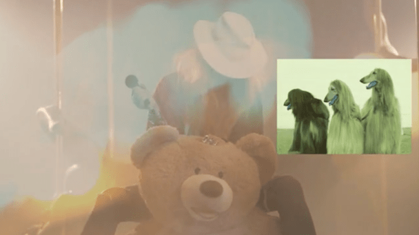 I re-watched the video for Black Bananas' "Physical Emotions" before writing this to see if it really was as awesome as I remembered. And yes, that's still a total blast. Now Jennifer Herrema has put together a video for "Creeping The Line," directed by Jess Holzworth, which achieves just the same trippy, carefree brilliance. It features Herrema riding on the shoulders of a giant stuffed teddy bear, playing with cats, and it features some hypnotically slow and physically challenging moves from a pole dancer. There's also that trio of dogs pictured above. Watch it below.