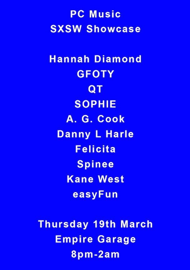 PC Music's SXSW showcase will take place on 3/19 at the Empire Garage in Austin. Full-lengths from Hannah Diamond and GFOTY are expected out before the end of the year.