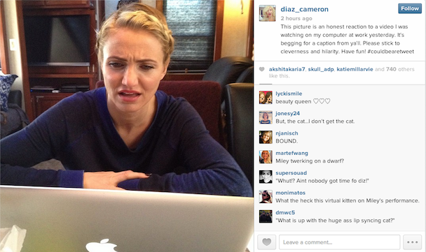 With it being so close to Thanksgiving Hanukkah, I thought it might be somewhat hard to find a caption contest photo for the caption contest this afternoon. The photos all might already be traveling home, I thought, or maybe they're just trying to get their photo work done so they can head out early. And for a while I was right! Thank goodness for Cameron Diaz, though, who provided us with an EXCELLENT option through Instagram today, saying, "This picture is an honest reaction to a video I was watching on my computer at work yesterday. It's begging for a caption from ya'll. Please stick to cleverness and hilarity. Have fun! #couldbearetweet" And it is begging for a caption from ya'll [sic]! What is she thinking?! Remember that it is an honest reaction, and please stick to cleverness and hilarity. Take your bullshit somewhere else, all right?