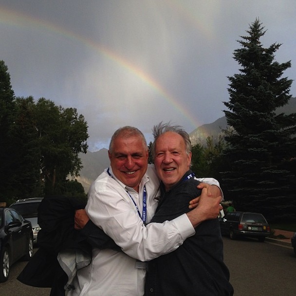 I hung out with children this past weekend. It was great! Children are wonderful because they are very emotional and weird and stubborn and kind, and hanging out with them is something I really enjoy. NO CREEPO. At one point the youngest child was going on and on about how much he liked a certain gift one of the adults had gotten for him a few months ago, and after a while of going on about it, he paused and said to the adult, "Thank you for getting it for me." CAN YOU IMAGINE? It was certainly one of the sweeter things I've witnessed recently -- a baby, practically, taking a moment to express his gratitude. (This baby also pointed out earlier in the day that "Even tough guys get owwies," which is just, like, does this baby ever turn it off?!) Anyway, this photo of Werner Herzog and Errol Morris hugging each other and smiling UNDERNEATH A RAINBOW at the Telluride Film Festival does not fill me with nearly the same amount of joy as that baby saying "thank you," but it certainly comes as close as it can! As, you know, a photograph of two documentarians! Does it fill you with the same kind of joy? Enough joy, at the very least, to CAPTION IT?! I CERTAINLY HOPE SO!