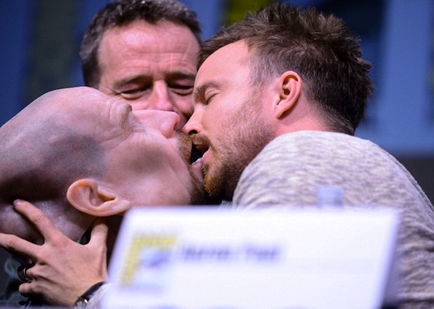 AHHH, GROSS! As we know, Bryan Cranston escaped having to interact with people while walking through the crowd at Comic-Con to the Breaking Bad panel by wearing a Heisenberg mask. Clever girl. We should use all use that technique when we go to our local cafe but don't feel like making small talk with the barista who recognizes you because of how often you go in there! (That's something we all don't like, right? When people know you, acknowledge that fact, and are friendly towards you?) Just wear a plastic mask of your own face! And then, who knows, maybe Aaron Paul will come out and kiss it for a gross photo op. You never know. And then maybe you can say, "Oh, haha, kiss the mask again, I forgot to take a photo." (You didn't forget.) And then you can say, "close your eyes," and then you can replace the mask of your face with your own face! And then Aaron Paul will kiss you, I don't know, I'm just spitballing!! CAPTION IT, PLEASE!