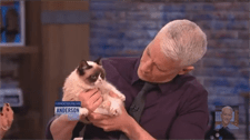 Sometimes I understand memes, but a lot of times I do not. I understand them when they are easy to repeat and everyone can make their own. Then it's, well, I don't know if it's fun, but it approaches something in the fun family. If the Harlem Shake meme were a little less racist, it would be understandable. Then you have memes where no one is really allowed to participate, as is the case with grumpy cat. Like, what the fuck am I supposed to do with grumpy cat? Sure, grumpy cat is a cat who looks grumpy. I get that. Give me SOME credit, I can totally tell that it is a cat who looks grumpy. But also the end? He's even less dynamic than dramatic chipmunk, because at least dramatic chipmunk MOVED. This is just a cat's face, a stranger's cat's face, not even my cat, and I'm over it. You know who isn't over it? The rest of America, I guess. Grumpy cat made an appearance on Anderson Cooper's daytime talk show, which I honestly thought was canceled, but I guess it's a different one? How many daytime talk shows does Anderson Cooper get? Now double it. He asks Grumpy Cat all the tough questions: