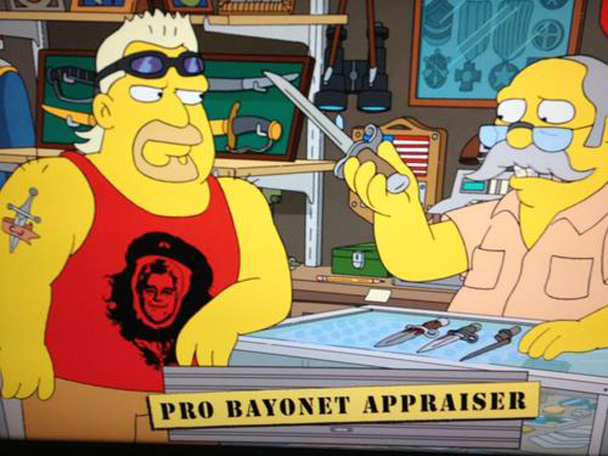 Admittedly, this is some inside baseball shit right here, but if you're going to pay any attention to what is happening in the worlds of comedy and television then you might as well pay actual attention! Right? I don't even know anymore. There either aren't enough hours in the day or there are too many hours in the day, and I am very bad at math. But, so, if you haven't been following the sad story of Jason Woliner's fashion enterprise, Je Shirt, you should follow it, because it is a tragic cautionary tale to anyone who thinks hopping into the novelty t-shirt industry is a piece of cake. He spent all of the money he earned being a beloved comedy director into making those Che Guevara shirts but with Jay Leno's face on them, and it landed him in a halfway home for aging gentlemen. (None of this is true! It is all to have some fun because life is short. Argh, sorry, I know I just gave away "the bit" but you guys, I don't like lying it really makes my eczema act up!) Anyway, you should just go read the Je Shirt blog because it is one of the funniest things around, and I don't think Je Shirt is currently producing any of their Che Leno or religious themed shirts, but maybe you can back order one and help dig Jason out of his horrible debt. Either way, a character on The Simpsons last night was wearing a Je tank-top, which is pretty neat*. I guess it really was all totally worth it, just like Amistad says. (Via Jason Woliner.)