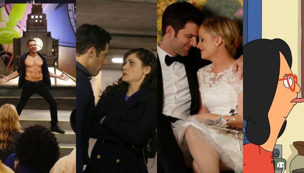 WHAT A BEAUTIFUL WEDDING! One thing you could never accuse Parks and Recreation of is being a nasty show full of horrible monster people who treat each other like garbage, because it is the exact opposite of that! What a sweet show! Most of my favorite comedic moments in this week's episodes (by the way, when the wedding episode ended I could not believe there was a whole other episode -- that wedding episode felt very long!) came from Andy. Specifically when he said "love you grandma" as the old lady closed her door on him and April. Hahah. Very good. The wedding episode was so sweet and beautiful that the second episode got a bit lost in the sweet and beautiful shuffle for me, but again I loved a bunch of Andy bits, specifically when he told everyone how he felt and it was a list of things people feel when they are depressed. A+. Good show! Bob's Burgers was very sweet this week, too, and also very funny! It was nice to see tough old Bob not be able to hold things together with Linda gone. MY ONE PEEVE was that the super market was a Trader Joes parody but also they said that it was a very cheap grocery store? UH-NUHUH. NOT A PARTICULARLY CHEAP GROCERY STORE AT ALL! Otherwise it was perfect. Very happy whenever Tina is happy. Very happy whenever they sing. I enjoyed Girls a lot this week. Adam and Whats-his-face were a good pair. I loved that Marnie thought she was co-hosting the party with that guy. When he exploded at her at the end, saying that she didn't want to be with him because she actually liked him and neither did anyone else, it felt very similar to when Thomas John exploded at Jessa two episodes ago or whenever. Like, you first assume that they want you to be on the side of the Girl but then the guy says the thing you've been thinking and it's like, wait a sec, he's saying the right thing! U KNO? You saw it, you know. That was great, though. Stupid Marnie, you big dumb dumb. #ebook. Community was fine! Enjoyable. What's going on with Annie and Jeff? Nothing, I hope? Sexual tension filler until the end of the series? I guess! I liked the joke about Pierce screwing up the American version of Inspector Spacetime. Ahhh, what else. New Girl was fine but not great. Kind of like they tried to do a bottle episode without the bottle? "If you're going to do a bottle episode, do a damn bottle episode!" -Kelly. LUVING the Nick&Jess stuff though. N+J=4ever. Kroll Show was also very good. The intro always makes me feel like I'm going to violently hate it, but then I love it! Kroll Show. WHAT DID YOU THINK NOW?