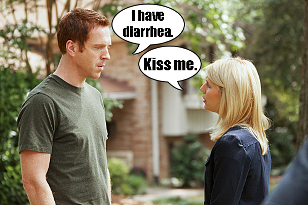 Have you been watching season 2 of Homeland? Ugh, did you even watch season 1 yet?! Come on, guys. Keep up. Season 2 is great! Actually, last week's episode and the week before that were both kind of duds for me. There was this one episode with an interrogation scene that was a real real good episode, and then I kind of felt like it didn't build off of or maintain the momentum of that one. But now it is back! Homeland! One thing I was thinking while watching last night's episode, though, where Sergeant Brody is being torn apart by competing forces in this dangerous game of international terrorism was how the show really doesn't address in any meaningful or realistic way how much diarrhea Sergeant Brody must have at all times. Some of us get diarrhea at the simple thought of having to call in the pizza order. WHY CAN'T YOU CALL? WHY DO I ALWAYS HAVE TO CALL? THE GUY WHO ANSWERS THE PHONE IS WEIRD AND I ALWAYS HAVE TO REPEAT THE TOPPINGS AND HE ALWAYS GETS MY NAME WRONG AND SOMETIMES I GET NERVOUS! There is no way that Sergeant Brody, in way over his head, manipulated by forces way outside of his control, his family unraveling all around him, and the imminent threat of death or imprisonment around every turn isn't just filled to the brim with explosive diarrhea. Oh, I'm sure the Vice President's wife is trying her best to cover it up, but at some point it's going to come out. (Gross.) Seriously, though, how much diarrhea does he have? So much. But how much?
