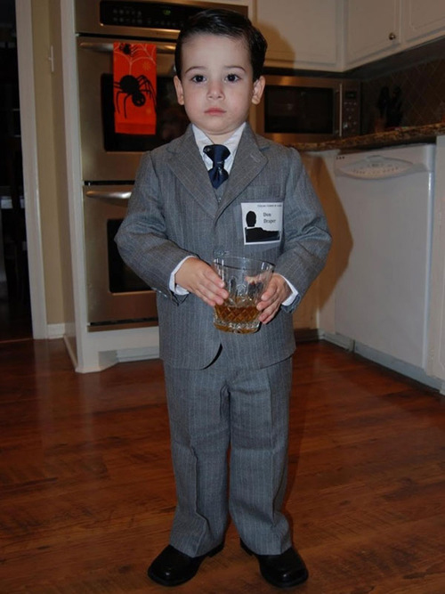 What's your favorite thing that baby Don Draper does? Is it when he psychologically abuses and/or cruelly ignores his long-suffering wife? Is it when he lies about his identity to his own family? Is it when he goes through a brief spell of full blown alcoholism that is surprisingly difficult to differentiate from his previous spells of pretty much full blown alcoholism? Is it when he chases his young wife around the apartment in a fit of rage and then has angry sex with her on the brand new carpeting? Is it when he threateningly sticks his baby hand up that comedian's wife's dress in the restaurant vestibule and throttles her vagina? (Gabe! This is just a human child we are making jokes about!) (You! Tell that to the parents who dressed him up as one of the worst possible male role models imaginable!) (You! Also relax! I'm not making fun of him, I'm making fun of his costume! Life is tough!) Was it when he abandoned his wife at the Howard Johnson because she didn't like ice cream or some shit? Was it when he seduced that Jewess? Was it when he stole a colleague's idea in a meeting because he was drunk and creatively unproductive and weak and terrified? Was it when he found that dead body? Was it when he lectured Peggy for the thousandth time in a sexist and condescending way that is almost certainly true of the time but that doesn't make it any less sexist or condescending? Was it when he took his children to Disneyland as a pretense for testing out the mothering capabilities of his secretary before manipulating their power dynamic to make her his wife? Was it when he fucked his daughter's teacher? Or was it his son's teacher? You know he probably fucked both of their teachers, right? Let's not quibble over which teacher. Oh, Baby Don Draper! You little cad! (Via FlavorPill.)