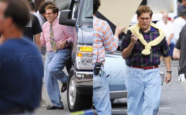 Here are a couple of photos of Jonah Hill on the set of Martin Scorcese's newest movie, The Wolf of Wall Street. Looking good, buddy! The movie stars Leonardo DiCaprio as Mr. Wolf (haha, I am not sure if this is true, but I will not be surprised if this is true) and here is a photo of him on the set of the same movie. So, even stevens! Just two good friends made to look almost identical in a movie. It's actually kind of hard to tell them apart! I bet some mornings Jonah Hill would walk into the makeup trailer and the makeup artist would start working and just making small talk and then about 20 minutes in she would be like "OMG, I am so sorry, I have been putting Leo's makeup on you for the past 20 minutes. Whoops! Well, I have to wash this all off and put on your makeup because your skin tone is just one grade different but almost identical, but Marty, I call him Marty, is such a pro that he will totally notice if I just let this slide. But obviously you can understand my confusion because you guys look exactly the same starting with the face and head and hair and glasses and teeth and continuing into the matching, handsome outfits. Oh well, I better get to work on fixing this even though if you ask me you do not even need any makeup because you look perfect. And can I just say that I'm so excited to see this movie, even though I am working on it? I am a Hollywood makeup artist, yes, but I am also just a fan, Mr. DiCaprio. Ahhh! I MEAN MR. HILL! Hahahah where is my head at today! Mama needs some coffee! Hahahahaha." I'm paraphrasing a little but something like that.