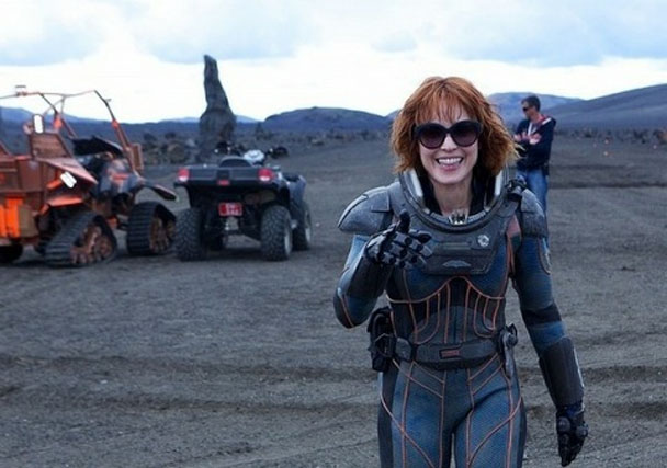 And now we're on the ship with our robot buddy and the whole thing is very Wall-E and we are ON BOARD. This is going great. This ship looks cool. Our alien buddy seems cool. Lawrence of Arabia is cool. All of it. Fist bump. And now we are arriving at our destination and everybody's waking up and Charlize Theron is doing push ups which is foreshadowing for how she's going to be a total BITCH, and everyone else is puking because of the future. The one crusty punk isn't here to make friends, which seems kind of aggressive, and also who gets into geology "for the money"? But whatever. Let's see what's up! What's up, guys?