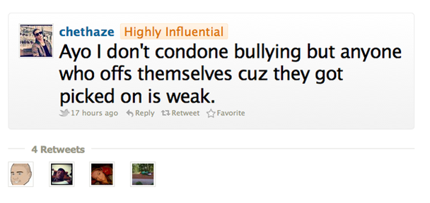 Oh brother. Really, dude? Within the infinite possibilities of the multi-verse there is an alternate planet Earth out there in which Chet Haze stopped for a second and thought, "Hey, why don't I NOT write this Tweet." That's a scientifically proven fact. (May or may not be a fact, but there is some kind of pop science behind it. I listen to RadioLab, OKAYYYY?) In general, there might be a little bit too much hand-wringing in the current trend of anti-bullying rhetoric. It all feels a little bit over-protective. Then again, children are actually hurting themselves and living in fear, so that's a problem too. The idea of telling a parent, or the child him/herself for that matter, to just buck up because it's going to build character and they'll be better off for it down the road seems like a tough sell. On the one hand, yes, everyone was basically bullied to some extent or another when they were younger, but there is a new reality to the reach and omnipresence of bullies, who can now populate the on-line world as well as the locker-filled hallway with their taunts and humiliation. That's tough! And new! No one actually fully understands the effects and ramifications of it because it genuinely hasn't existed before. So, there's that. The point I'm making is that in the general debate over modern bullying, I'm not sure how anyone could be anything other than ambivalent because there are fair points to be made on either side of things. (This does not mean that anyone needed Chet Haze to jump into the fray. But we're about to get back to him in a second.) All of that being said, the issue of bullying is inarguably problematic when we get to the subject of SUICIDE, which is an altogether terminal and serious thing. No duh. Even a Northwestern student should know that.