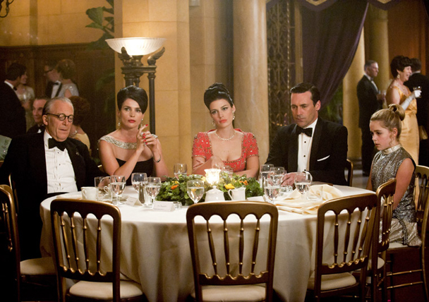 |Emile Calvet (Ronald Guttman), Marie Calvet (Julia Ormond), Megan Draper (Jessica Pare), Don Draper (Jon Hamm) and Sally Draper (Kiernan Shipka) - Mad Men - Season 5, Episode 7 - Photo Credit: Ron Jaffe/AMCGET THE STEREOGUM DIGEST