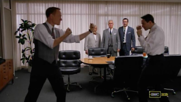 Another weird episode! This one was directed by John Slattery. Should he direct more things? I'll leave that to Judge Judy to decide. But there were some very odd moments, like Pete's face dissolving into Pete's face, a matchy-matchy office door transition, Ken's two-sentence short story about Beethoven at the end, and the pacing of the scene where Handsome shows up to driver's ed made me feel like a lunatic. Is. This. Show. On. Cough. Medicine. Or. Am. I. On. Cough. Medicine. Or. Both. But overall it was still good. Love the "party blazers," boys! How many ladies watching last night's episode were rushing to the kitchen trying to sabotage their sinks so that Jon Hamm could rush over and fix them? All? All the ladies? Take your shirt off slower, Don, the sink isn't on fire! Meanwhile, Pete is right: Don is pretty ballsy giving him the side eye. Regardless of whether or not he thinks highly of Pete and is disappointed to find out that he's as "human" as everyone else (being "human" means claiming that it's "just doing your job" to sleep with prostitutes and just generally seeking out as many ways as possible to undermine your marriage, right?) it's really not for him to cast any aspersions on anyone else's moral conduct just because he married a 25-year-old and is getting it wet on the regular. Then again, does Pete seriously need to stare at the faucet that's going to break soon? Or wistfully linger on Handsome's biceps? Take a night class in home repair, dude! Do some push ups, buddy! Fuck your WIFE! But, of course, This Week's Zou Bisou Bisou was the conference room fist fight between Lane and Pete and all I have to say is: YES, GOOD POINT. More things should be settled this way. I'm not joking. No one should get seriously injured, but a couple spots of blood on your silk neckerchief are in order when you are being a real PRIG. This is how men used to resolve their problems, and it worked out just fine. (I have no idea if it actually worked out fine. I'm assuming that it was actually pretty problematic in most cases and is obviously the mark of a brutish and immature society. Nevertheless, it is appealing. You loved it. Everyone loved it. Get him! Finish him!) It used to be if another man insulted you at George Plympton's apartment, you'd punch that man square in the mouth. And for God's sake, YOU DIDN'T TWEET ABOUT IT. (Although you know that Pete would have TOTALLY Tweeted about it and that's why his face got ROCKED.) If you see something, punch someone.