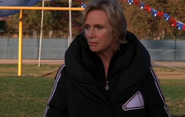 Right, okay, so time to Gleecap that shitbomb? I guess it’s important to keep in mind that there’s another new episode on tomorrow night, so technically, we can all forget this ever happened and pretend the second season is coming back from hiatus on Tuesday? Because, in the end, nothing permanent or new even happened last night. Plot-wise, it was totally stand-alone, wrapped up back at square one by the end credits, like a Simpsons episode (minus jokes and <3).The episode starts in Cheerio’s rehearsal—the cheerleaders are wearing Katy Perry wigs and jumping around to “California Gurls” while random BMX dudes do flips and tons of fire flies around. Sue’s bored by the spectacle and wants more. She does a little soul-searching/journaling (always good for a joke)—she reveals that her doctor has her on raccoon hormones, she’s 31-years-old, and has a back tattoo of herself with her name spelled wrong (“Sue Syvlester”). Funny enough. Goodbye jokes for the rest of the time! Anyway, she decides the only thing that’ll make her Cheerio’s routine good enough in her eyes is a human cannon.Meanwhile, the football team sucks. Finn sucks and fucks up some plays, and the rest of the team also sucks and fucks up some plays. FOOTBALL BULL 3 focuses his hatred-horniness on Finn (ape bottom? yeah right), and the team morale goes to shit. Coach Bieste and Schue (he’s the football team’s helmet specialist: “just a bottle of Garnier Fructis Nectarine White Ginger Pommade Spray before kick off will do ya”—Schue) decide to overcum the bullying once and for all by forcing all the FOOTBALL BULLIES to be in Nude Erections for a week. Ugh. No one likes the idea on the show, or in the audience (speaking for myself here).