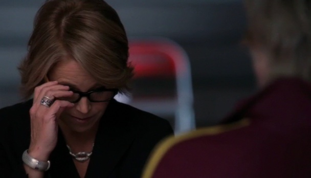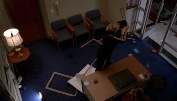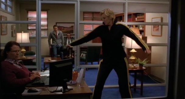Principal Figgins takes Sue’s cannon away from her because it’s so fucking dangerous, which sends her into a rage. She trashes his secretary’s office, and then the boys’ lockerroom (NAKED SAM IS GOING TO BE DEVASTATED THAT YOU SULLIED HIS FAVORITE HANGOUT AREA IN OHIO). It’s funny, okay? I’ll admit that I enjoyed seeing Sue throw stuff around.