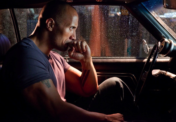 Dwayne “The Rock” [hard] Johnson [get it?] plays “Driver”—a dude whom we meet as he struts out of prison, free to sprint straight to a municipal dump where a sports car, leather jacket, revolver, and map are waiting for him. From there he screeches onto the road, stomps right through a cubicle farm in a random office complex in the California suburbs, and blows the brains out of a telemarketer’s head, while all his coworkers read blogs and chug coffee, or whatever people with jobs do.