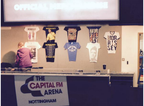 Now another Moz fan finds himself in a similar situation. A forum user at Morrissey-solo.com under the name of @MorrisseyGang said a man named Sean Preston from Merchandising For Life contacted him about using the above image of a naked Morrissey shutting up the Queen of England, which @MorrisseyGang designed. The designer said he'd be willing to let the company use his image if they made a payment offer, and he never heard back. Then photos of Morrissey's tour merchandise started popping up online, and @MorrisseyGang noticed that his image was on one of Moz's newest tour T-shirts. Check it out on the far left of the merch table and then close up.