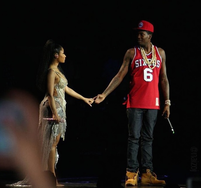 At this point, Drake has definitively won his feud with Meek Mill, but Meek is not willing to accept that yet. A few nights ago, Meek took some more shots at Drake in a live freestyle. And last night, as Complex reports, he did it again. Opening for Nicki Minaj in Camden, New Jersey, Meek seized on the idea that he is actually with Nicki Minaj, Drake's longtime crush: "I still wake up with the lady that you said you first in line with / Did five months, came home, that's perfect timing / To make a sucka nigga look sucka without trying / If Quentin Miller wrote that shit, why were we buying?" Also: "Niggas turn to hoes, Caitlyn Jenners turn to Drizzy Drakes." Yeek. That's demeaning and it doesn't even make sense. Watch it below.