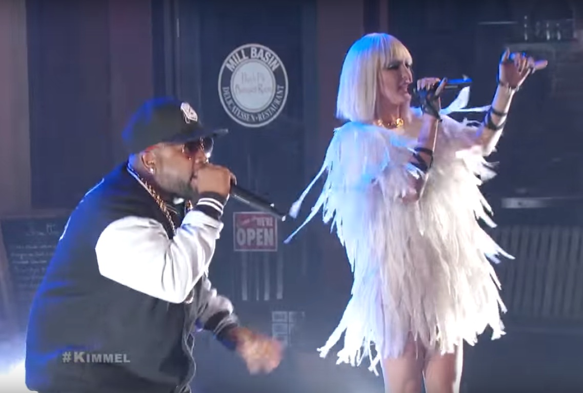 Jimmy Kimmel Live, currently right in the middle of a week of shows filmed in Brooklyn, had a big night last night, welcoming Bernie Sanders as a guest and bringing in Michael J. Fox to talk about Back To The Future on the movie's big viral day. And it also featured Big Grams, the duo of Big Boi and Phantogram, who released their first EP as a group last month. On the show proper, the group performed "Drum Machine," with a whole crew of young Brooklyn marching-band drummers -- the Brooklyn Express Drum Line -- helping them out. And as an online bonus, they also didthe EP track "Goldmine Junkie." These guys are continuing to gel as a live act, and these performances sure seem to indicate that they'll be polished and ready when festival season rolls around next year. Watch both performances below.