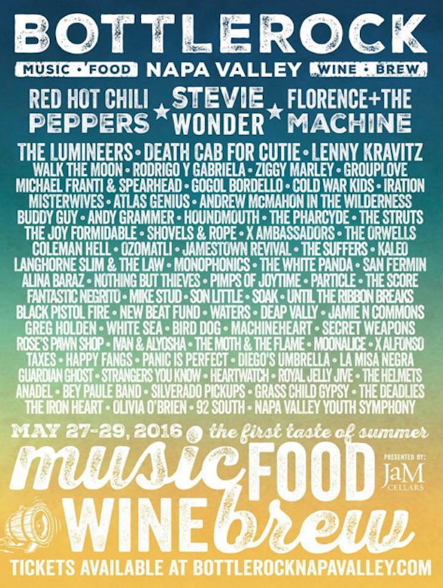 Napa Valley, California's BottleRock Festival is the rare music festival that does not give one solitary fuck about being cool, which might by why the 2014 festival featured forgotten '90s relics like Smash Mouth and the Spin Doctors alongside Matt & Kim and Deerhunter. They've just announced the lineup for this year's fest, which goes down 5/27-29, and the headliners include the perennial forces Stevie Wonder and Red Hot Chili Peppers, alongside Florence + The Machine, maybe summer 2016's busiest festival act. The bill includes plenty of questionable names -- the Lumineers, Lenny Kravitz, Andy Grammer. But there are also plenty of quality artists, including people you might not have thought about in a while: Buddy Guy! The Pharcyde! The Joy Formidable! The festival also features Death Cab For Cutie, Gogol Bordello, SOAK, White Sea, and plenty of others. We've got the full lineup below.
