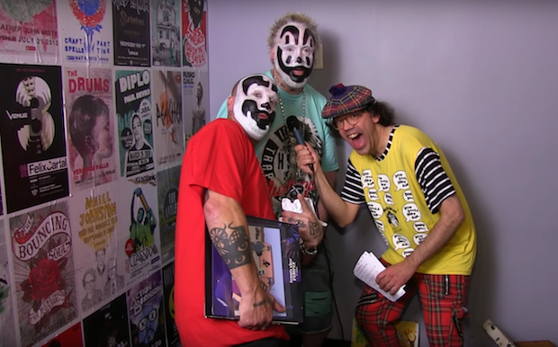 The last thing I thought I'd be doing this morning is watching an interview with Insane Clown Posse, but here we are! Nardwuar interviewed the clown-rap duo the last time they rolled through Vancouver, and Violent J and Shaggy 2 Dope start off as overly animated but gradually calm the fuck down (for the most part) as Nardwuar does his characteristically charmingly disarming gift-giving thing. They talk about the greatness of Sir Mix-A-Lot, dating girls at Kinko's, Scharpling & Wurster, and Kid Rock's infamous glass dildo. (Violent J: "A glass dildo? Not that I would have any particular uses for it myself, but I'd probably keep it if you gave me one.") Watch the interview below.