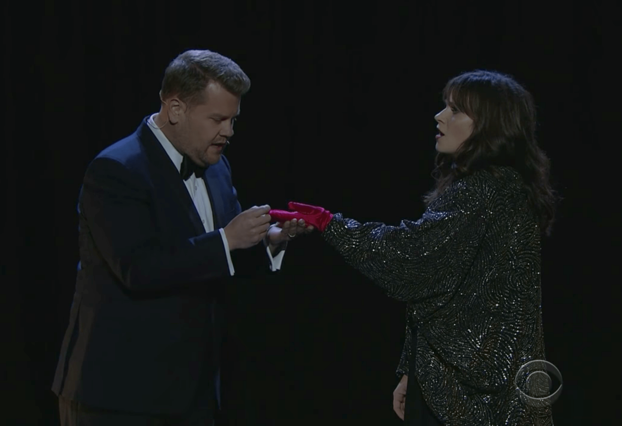 Last night, James Corden invited Zooey Deschanel onto his show to cover Lionel Richie and Diana Ross' 1981 duet "Endless Love." But instead of "love" they sang "glove." See, Deschanel was wearing a really long red satin glove. Try harder, Corden.