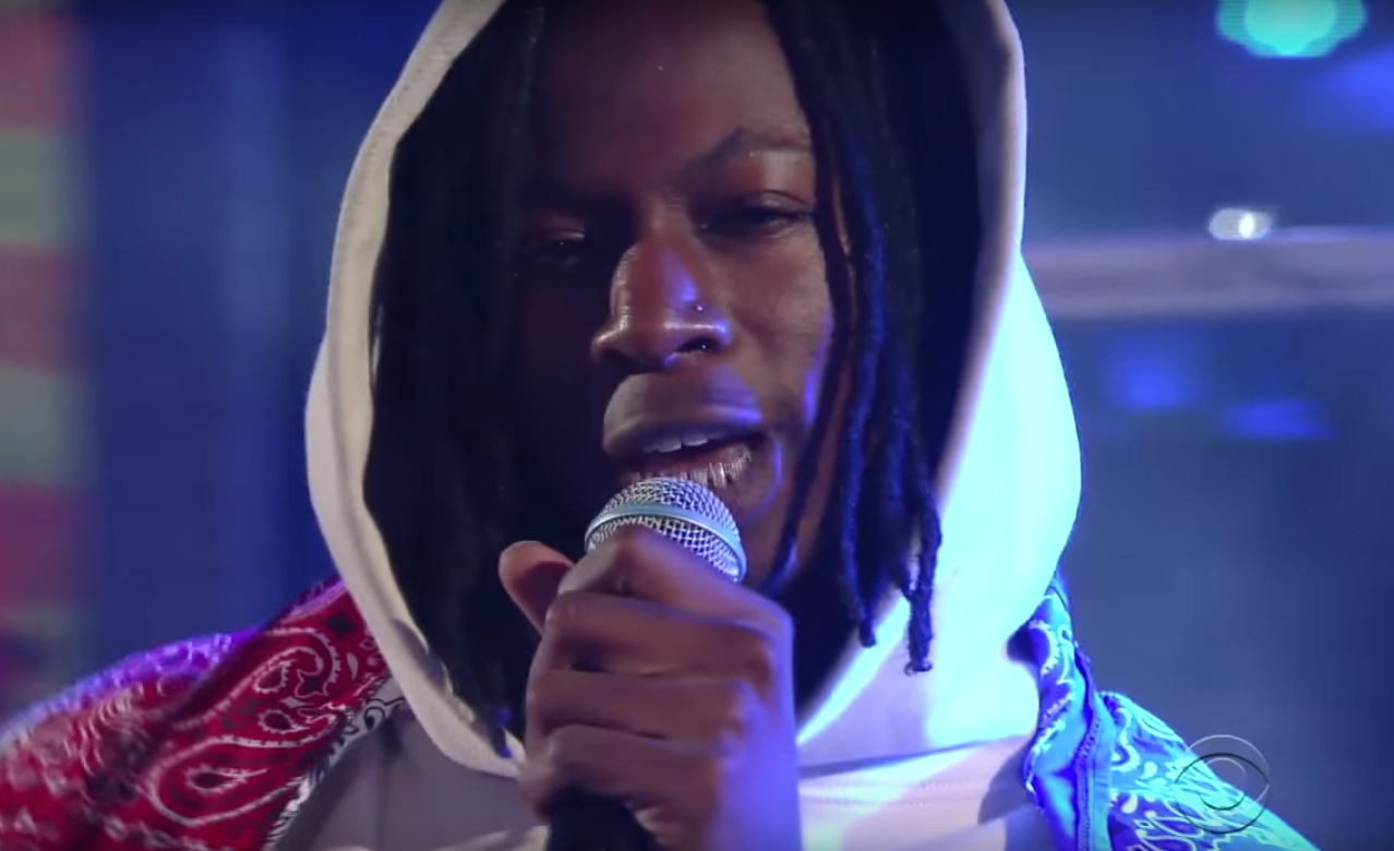 On Friday, Brooklyn rap fixture Joey Bada$$, who was a Stereogum Artist To Watch almost five years ago, will release his new album All-AmeriKKKan Bada$$. And last night, he was on Stephen Colbert's Late Show to perform "Land Of The Free," the politically heated track that he released on the day of Donald Trump's inauguration. Bada$$ brought as much gravitas as he could to the performance, rapping with a live band behind him and wrapping himself in the stitched-together-bandanas American flag from his album cover. Watch it below.