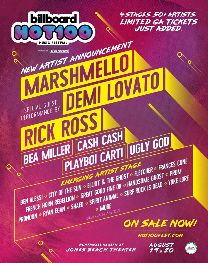 Rick Ross and Marshmello are the latest performers announced to join Billboard's 2017 Hot 100 Music Festival, which will be held 8/19-20 at Northwell Health at Jones Beach Theater outside New York City.