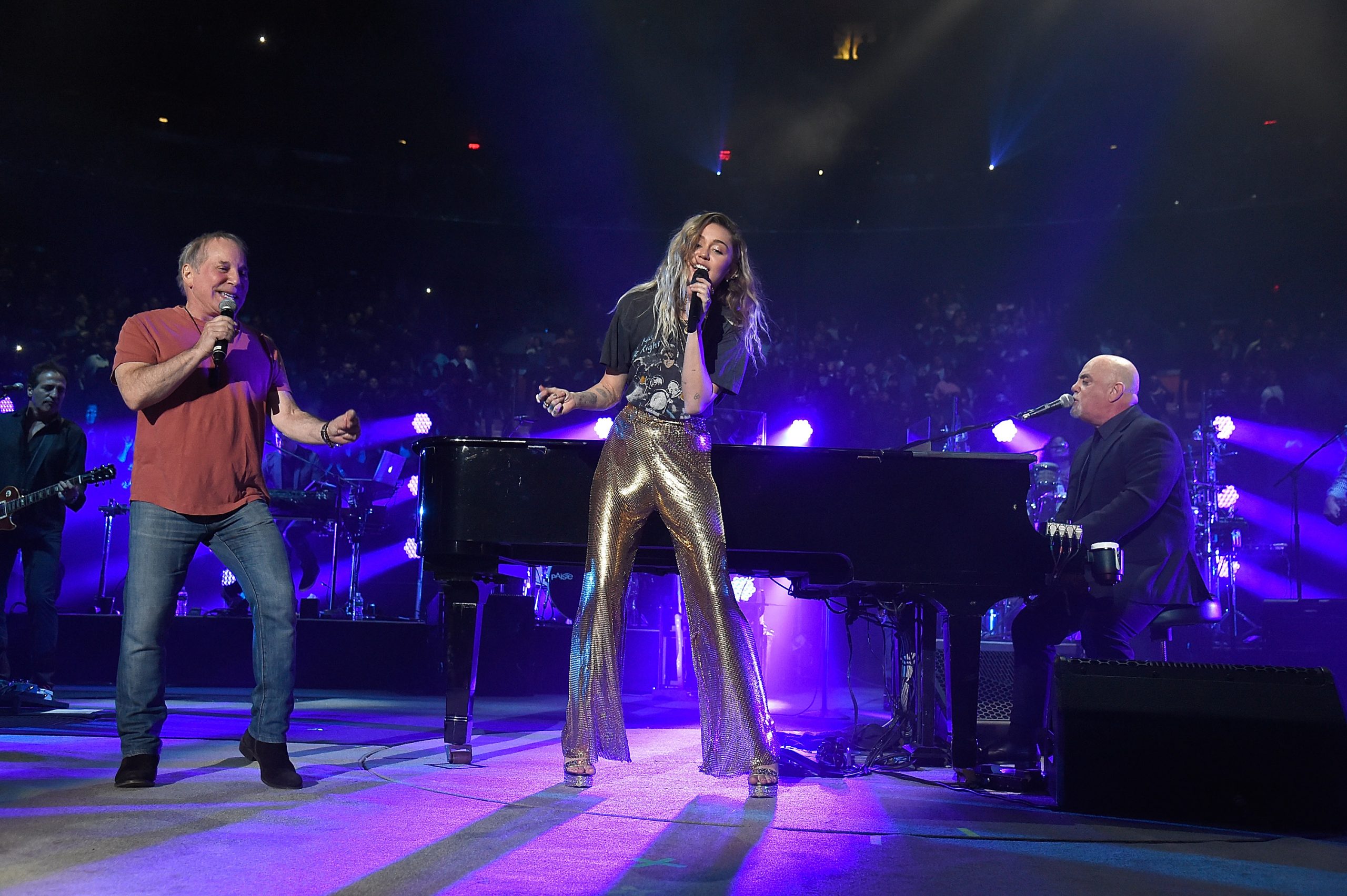 Billy Joel performed another show as part of his long-running residency at Madison Square Garden last night, and he brought a couple of friends along. Paul Simon came out to do "The Boxer and "Late In The Evening" and Miley Cyrus made a surprise appearance to help out with "New York State Of Mind," and later in the show, both artists returned to the stage for an all-star rendition of "You May Be Right." Watch below.